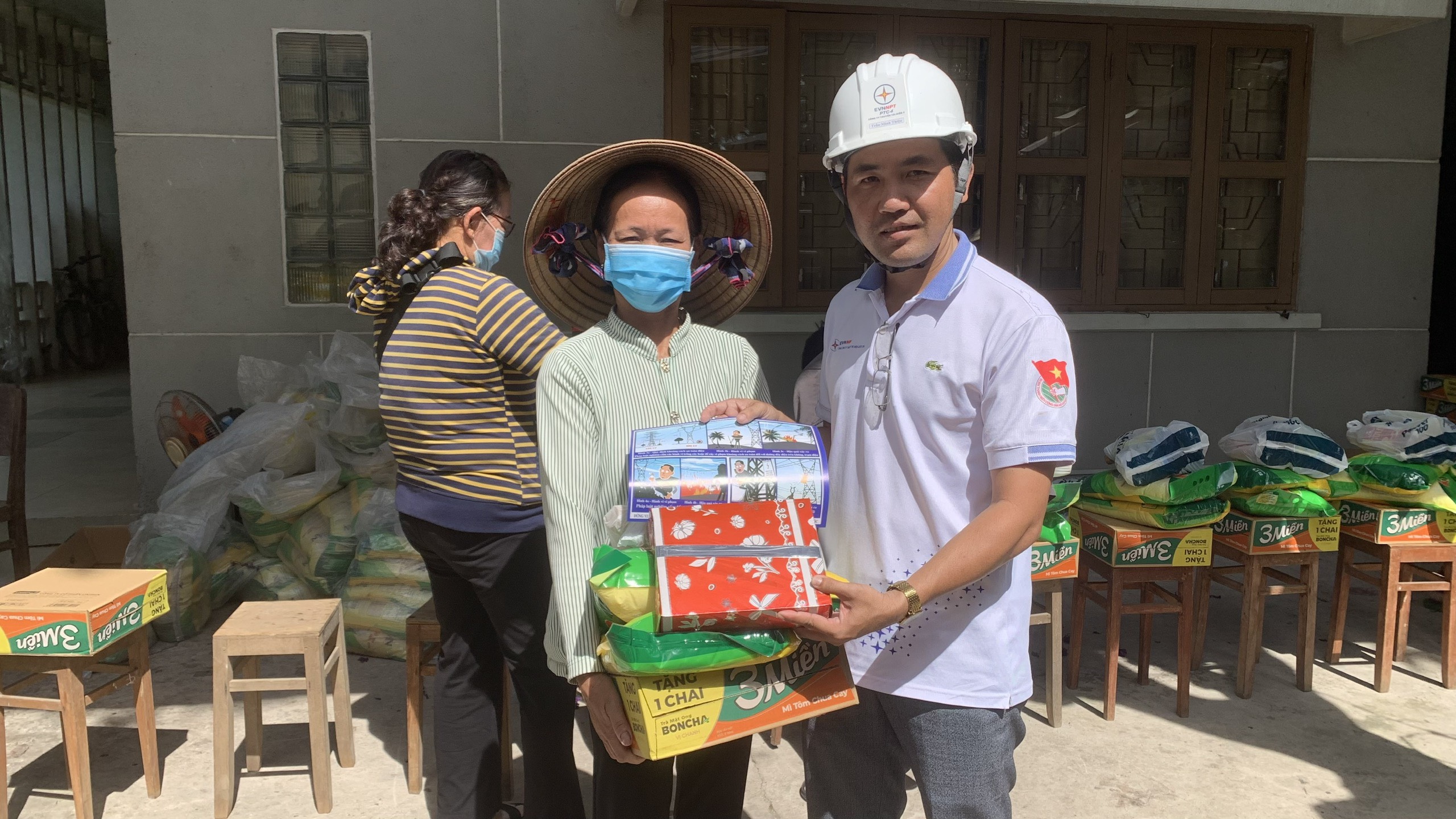 Ông Trần Minh Thiện - Bí thư Chi đoàn TTĐMT2 tặng quà và tập tuyên truyền cho người dân
