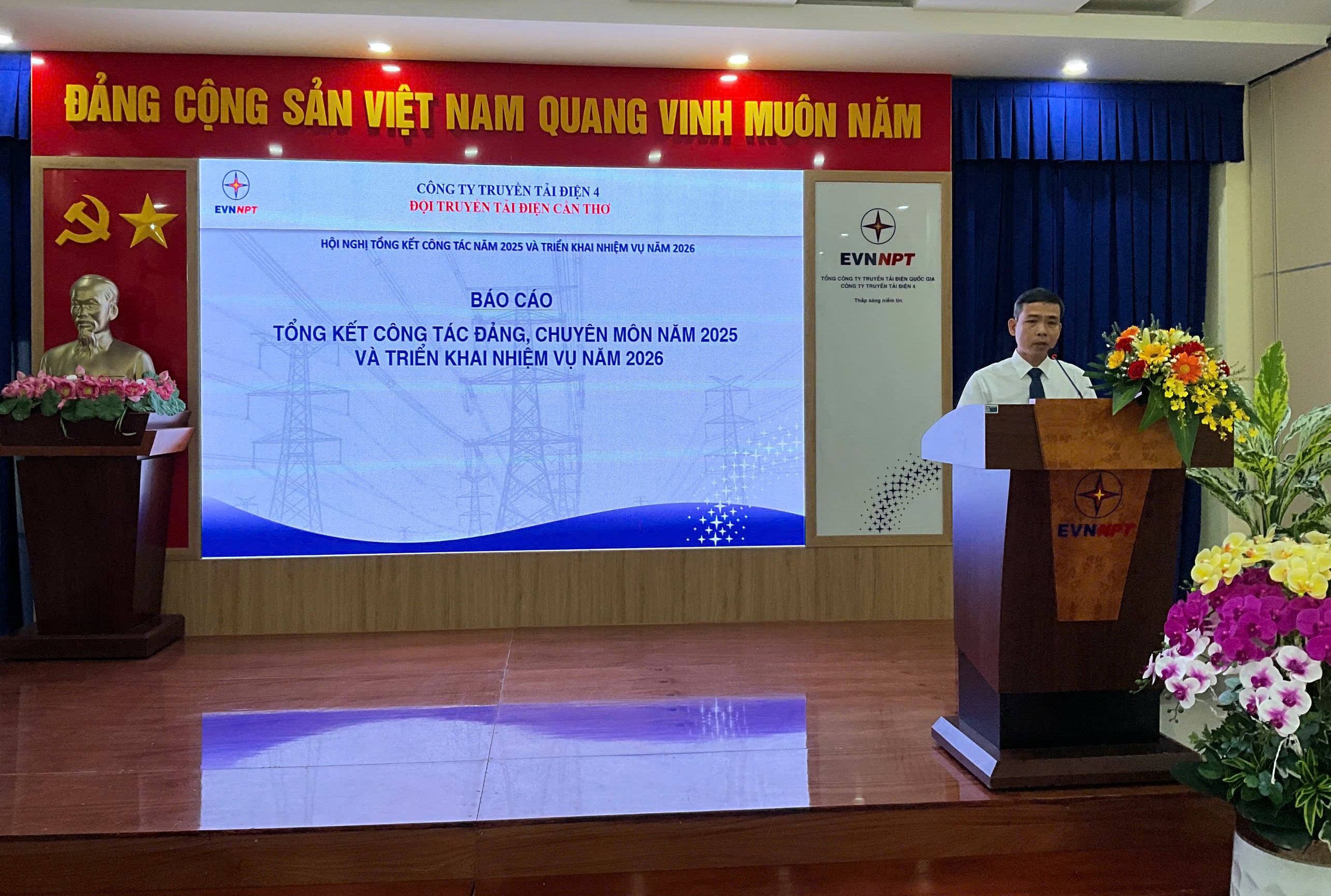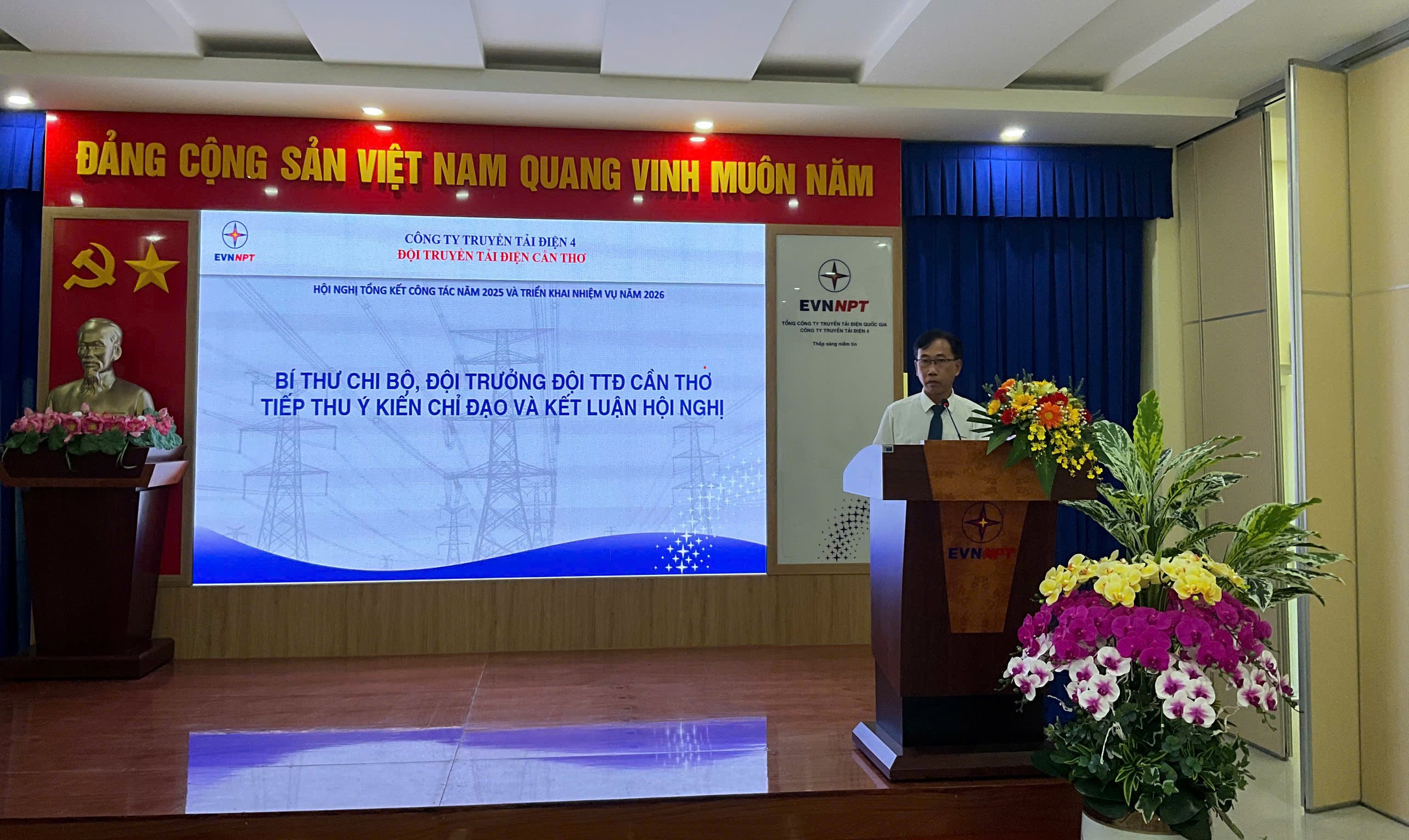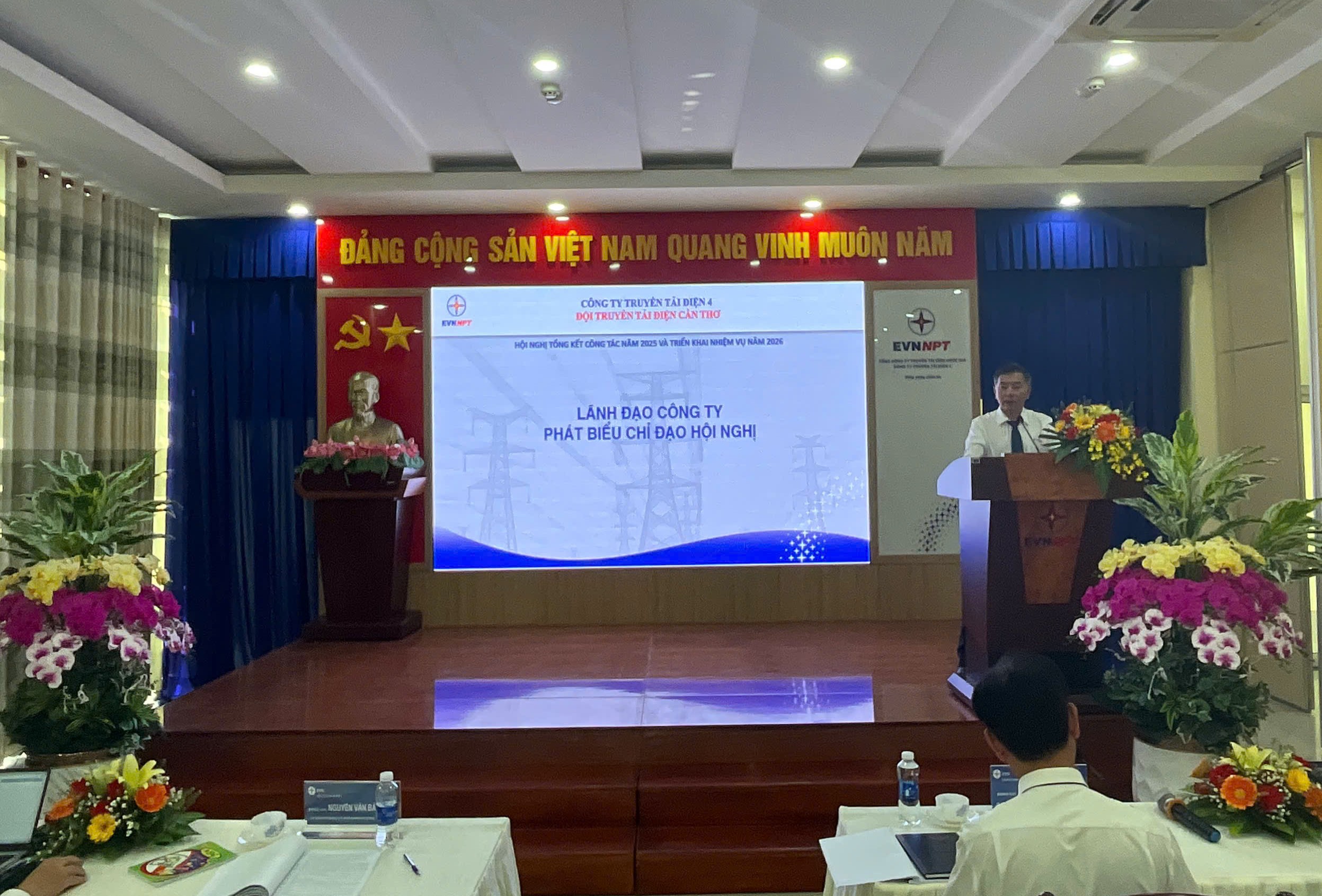 Phát biểu chỉ đạo tại Hội nghị, đồng chí Nguyễn Văn Bảy – Phó Giám đốc Công ty Truyền tải điện 4 đã ghi nhận, đánh giá cao những nỗ lực và kết quả đạt được của Đội Truyền tải điện Cần Thơ trong năm 2025; đồng thời thông tin về tình hình thực hiện các chỉ tiêu kinh tế – kỹ thuật của Công ty và định hướng nhiệm vụ năm 2026. Đồng chí nhấn mạnh yêu cầu tăng cường công tác ngăn ngừa sự cố, nâng cao chất lượng quản lý vận hành, đẩy mạnh ứng dụng khoa học công nghệ; bày tỏ tin tưởng Đội Truyền tải điện Cần Thơ sẽ tiếp tục phát huy truyền thống đoàn kết, chủ động, sáng tạo, hoàn thành tốt nhiệm vụ được giao trong năm 2026 và những năm tiếp theo.