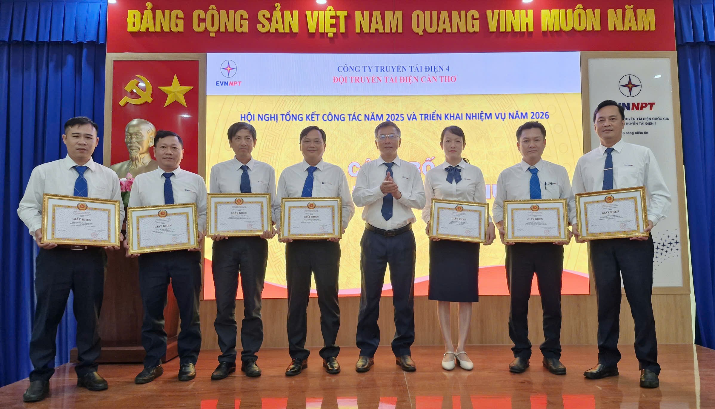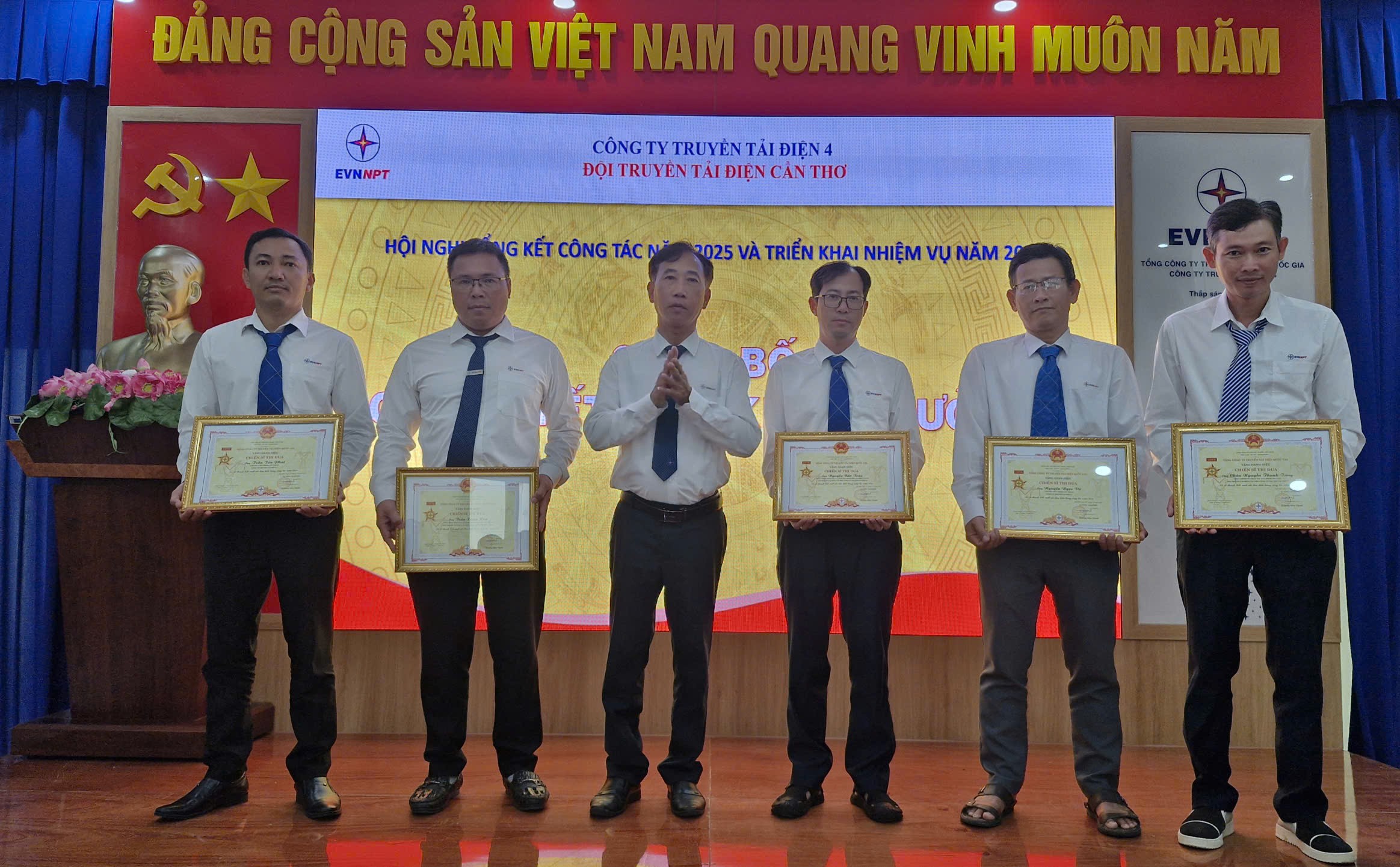 Ông Nguyễn Văn Bảy – Ủy viên Ban Thường vụ Đảng ủy, Phó Giám đốc Công ty Truyền tải điện 4 trao Giấy khen của Đảng ủy Công ty Truyền tải điện 4 cho các Đảng viên của Chi bộ Đội Truyền tải điện Cần Thơ đạt thành tích xuất sắc năm 2025
