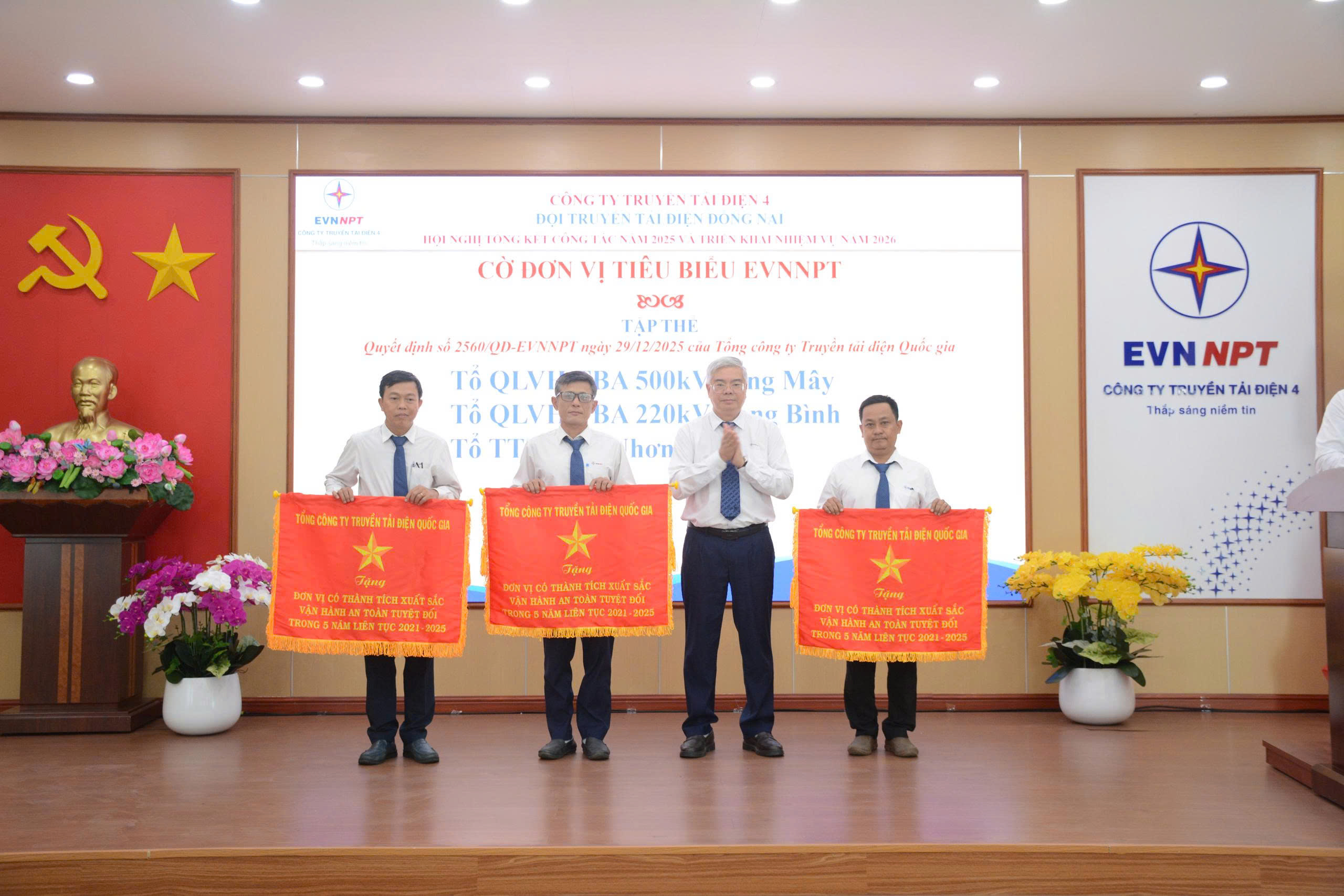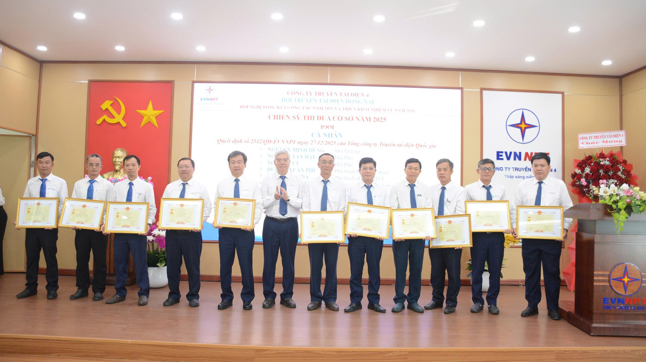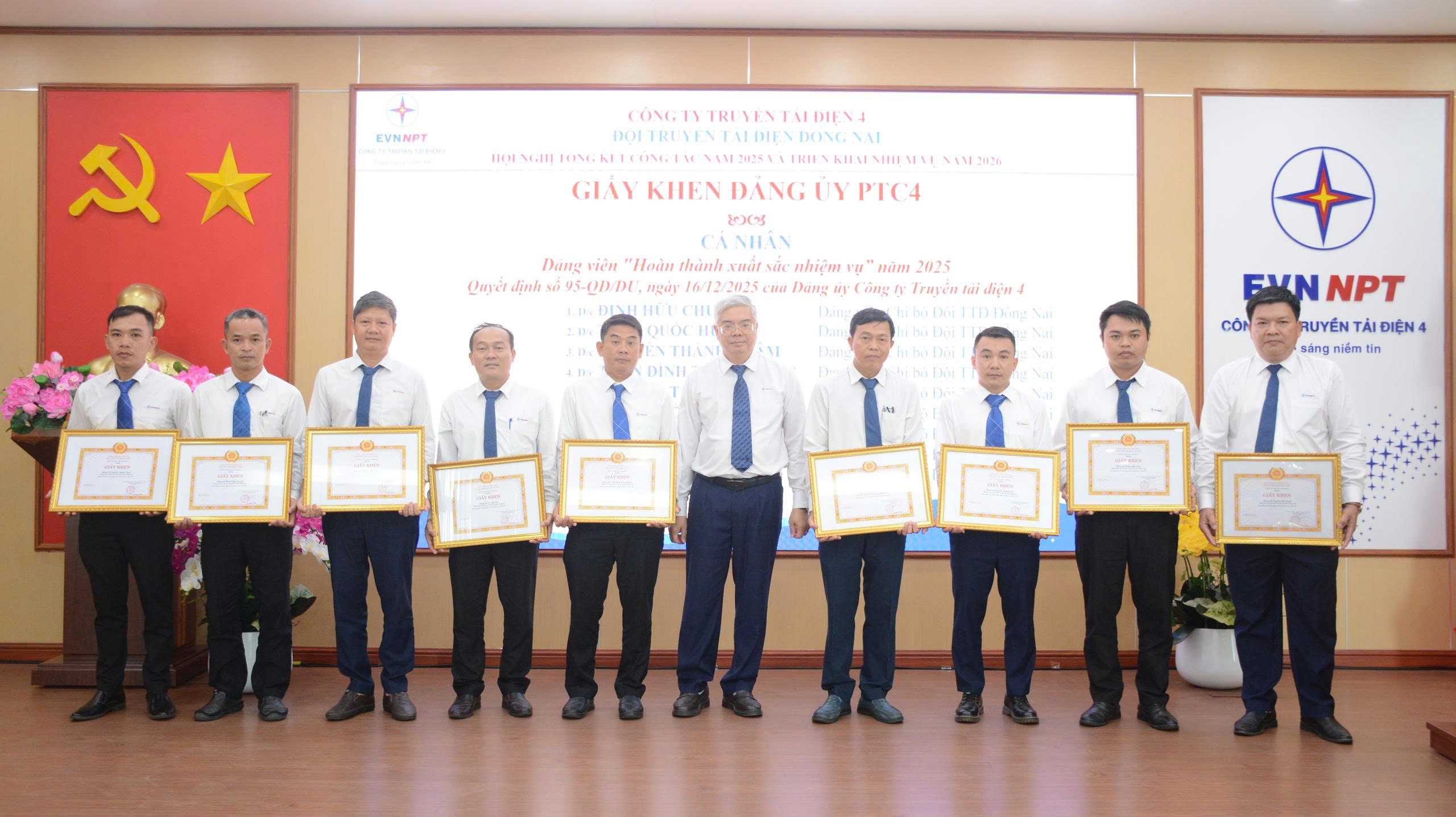 Tại Hội nghị, nhiều tập thể và cá nhân có thành tích xuất sắc trong năm 2025 đã được biểu dương, khen thưởng với các danh hiệu cao quý như Cờ thi đua và Giấy khen của Tổng công ty Truyền tải điện Quốc gia và Công ty Truyền tải điện 4.