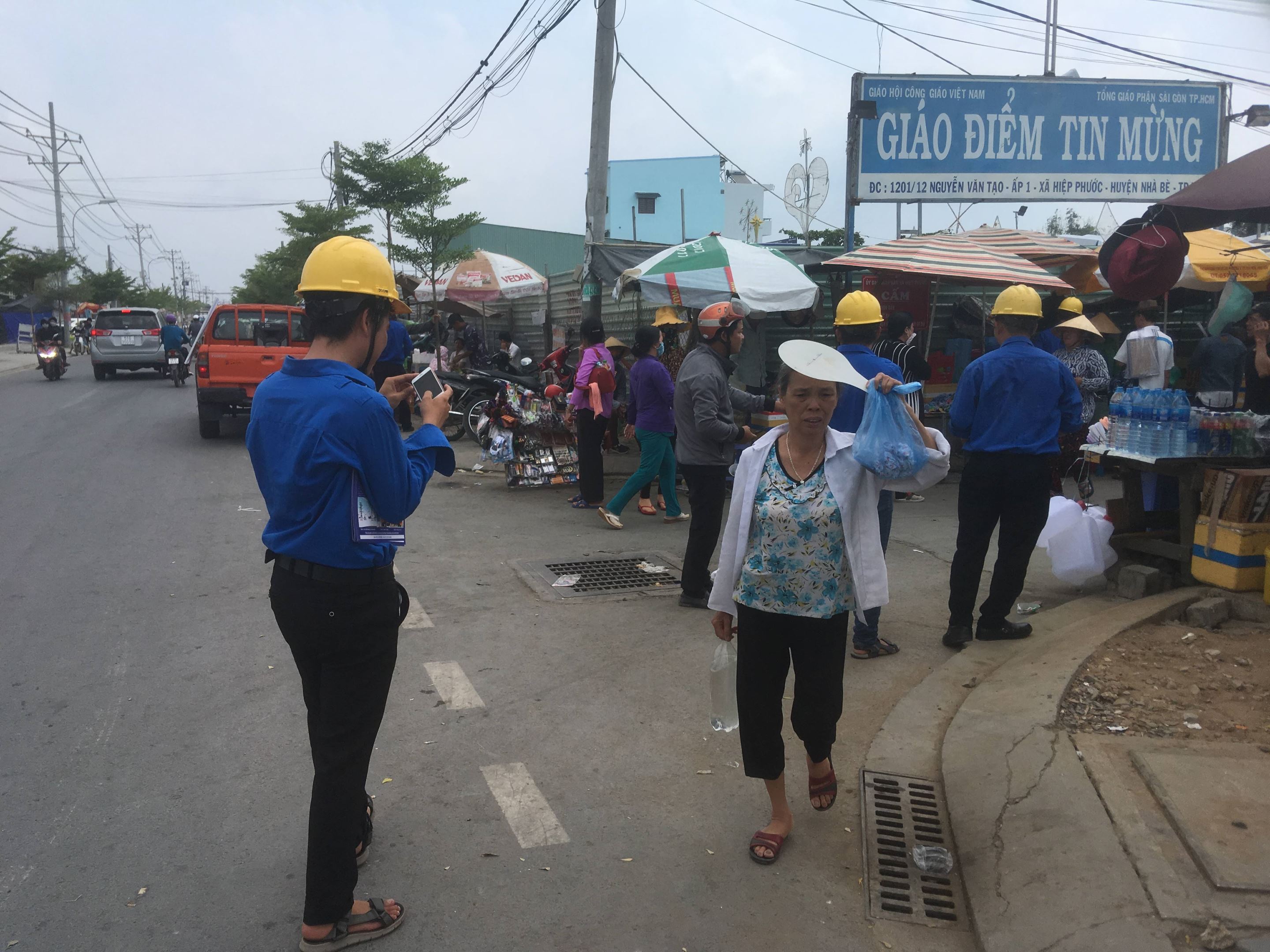 Đoàn viên thanh niên Truyền tải điện Thành phố Hồ Chí Minh tuyên truyền về phòng cháy chữa cháy cho người dân tại khu vực xung quanh Giáo Điểm Tin Mừng.
