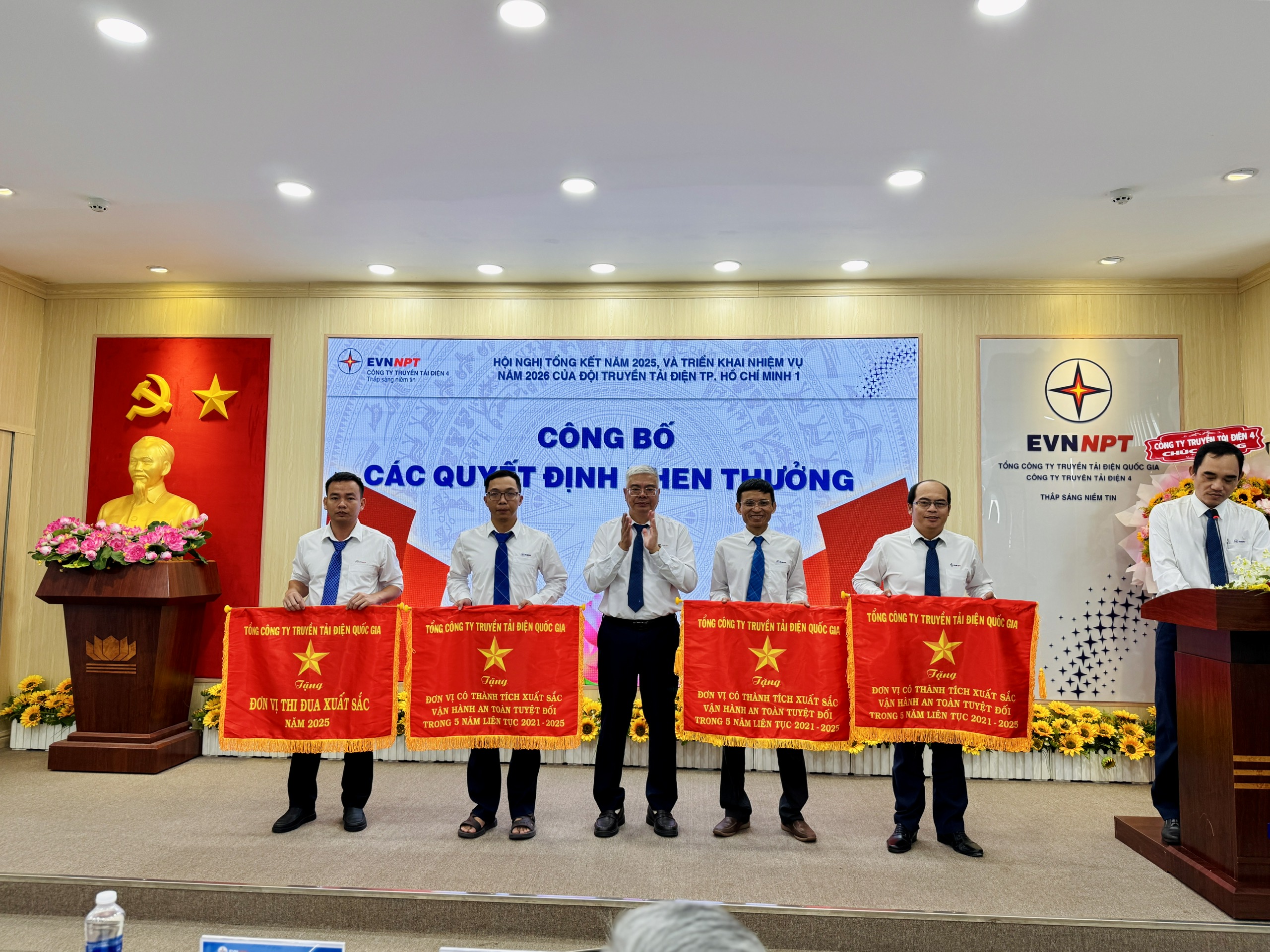 Dịp này, Đội TTĐTPHCM1 đã công bố và trao các Quyết định khen thưởng năm 2025, kịp thời ghi nhận các tập thể, cá nhân có thành tích tiêu biểu trong phong trào thi đua và thực hiện nhiệm vụ. Theo Quyết định số 2560/QĐ-EVNNPT ngày 29/12/2025, EVNNPT trao Cờ “Đơn vị tiêu biểu” cho các tập thể đạt thành tích xuất sắc, vận hành an toàn tuyệt đối 05 năm liên tục, gồm: Trạm 220kV Hóc Môn; Trạm 500kV Phú Mỹ; Tổ Thao tác lưu động Mỹ Xuân; Tổ Thao tác lưu động Vũng Tàu.