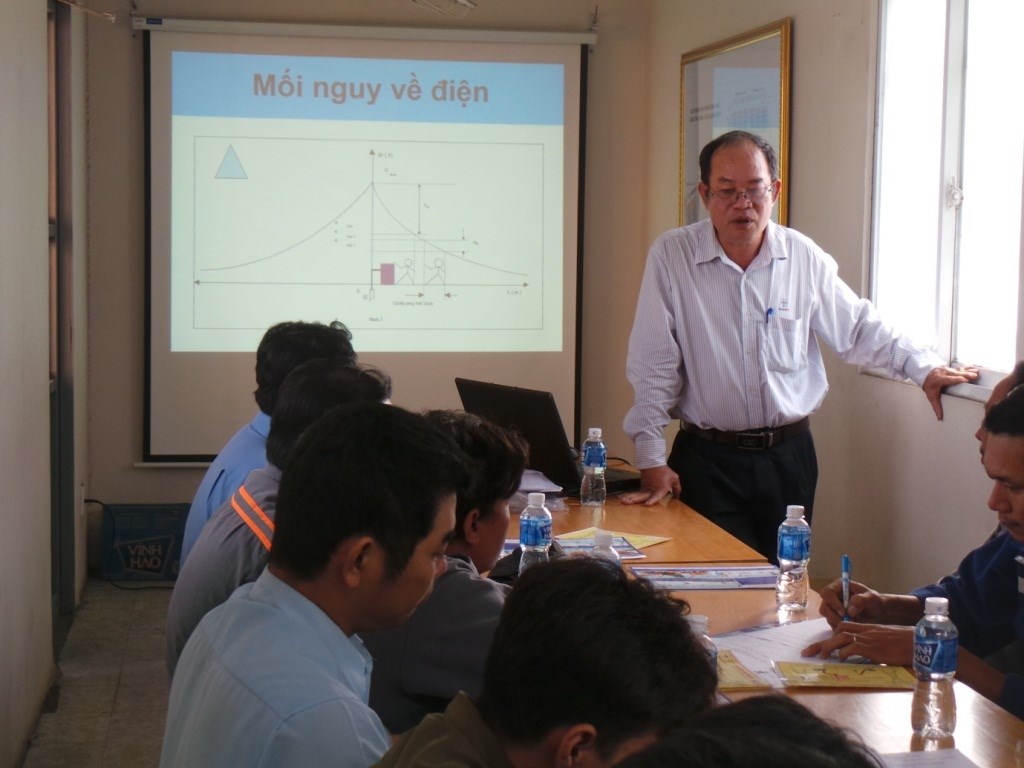 Anh Vũ Đình Tài (người đứng) – nhân viên đội Thủ Đức hướng dẫn lý thuyết an toàn điện cao áp cho các nhân viên Công ty Giang Nam
