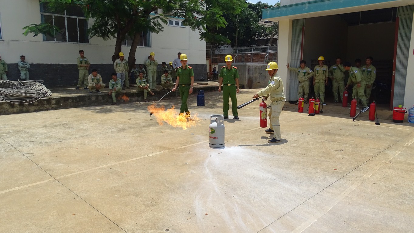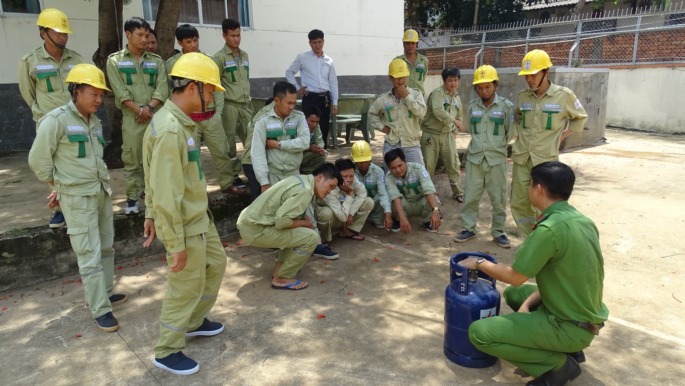 Sau khi các cán bộ cảnh sát PCCC phổ biến và hướng dẫn, các CBCNV đã được thực hành tại hiện trường giả định, sử dụng bình chữa cháy để dập tắt các đám cháy do bình gas, khay xăng dầu phát cháy.