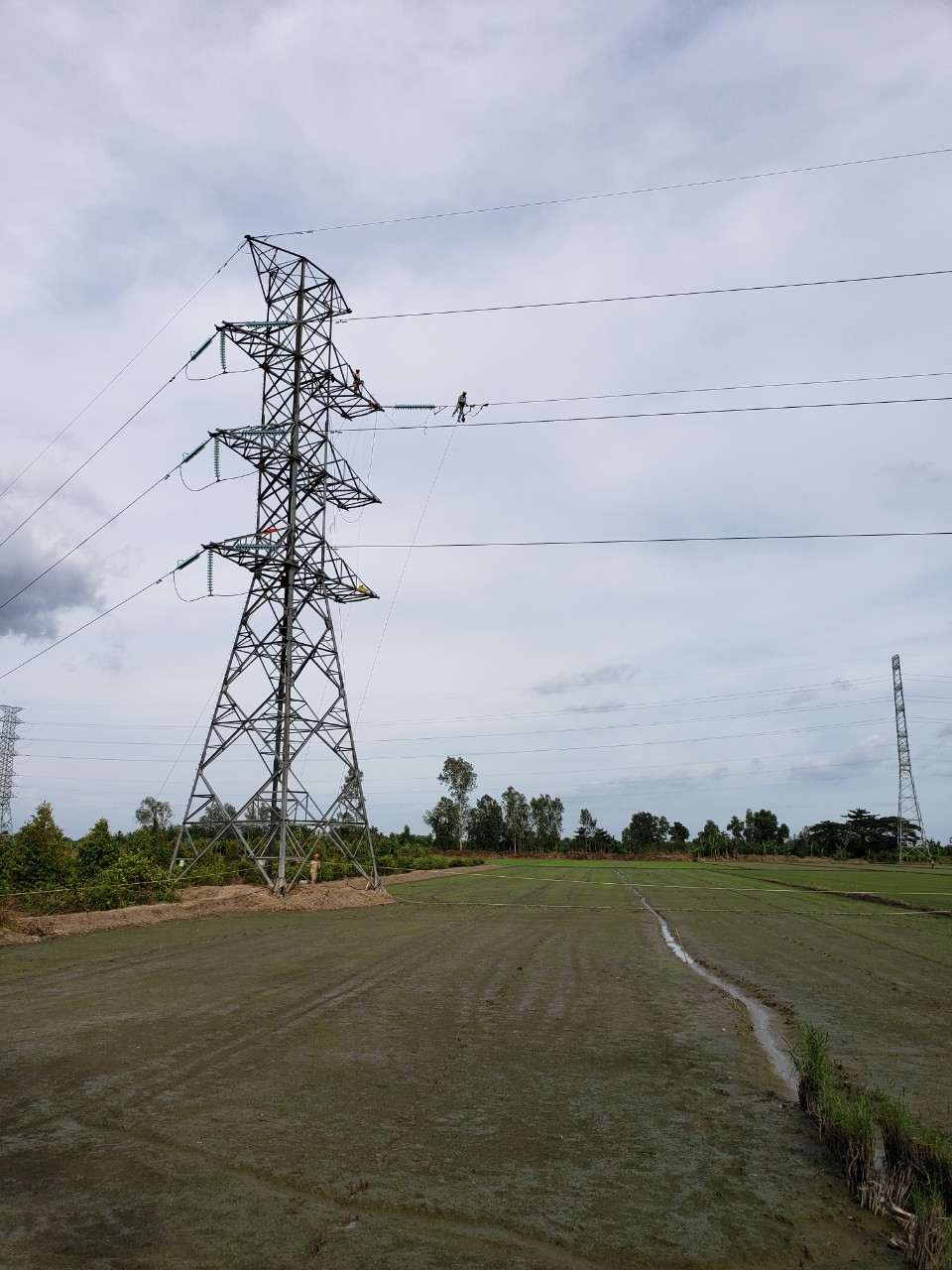 Tổ công tác đang thi công kéo dây đường dây 220kV Ô Môn – Sóc Trăng.