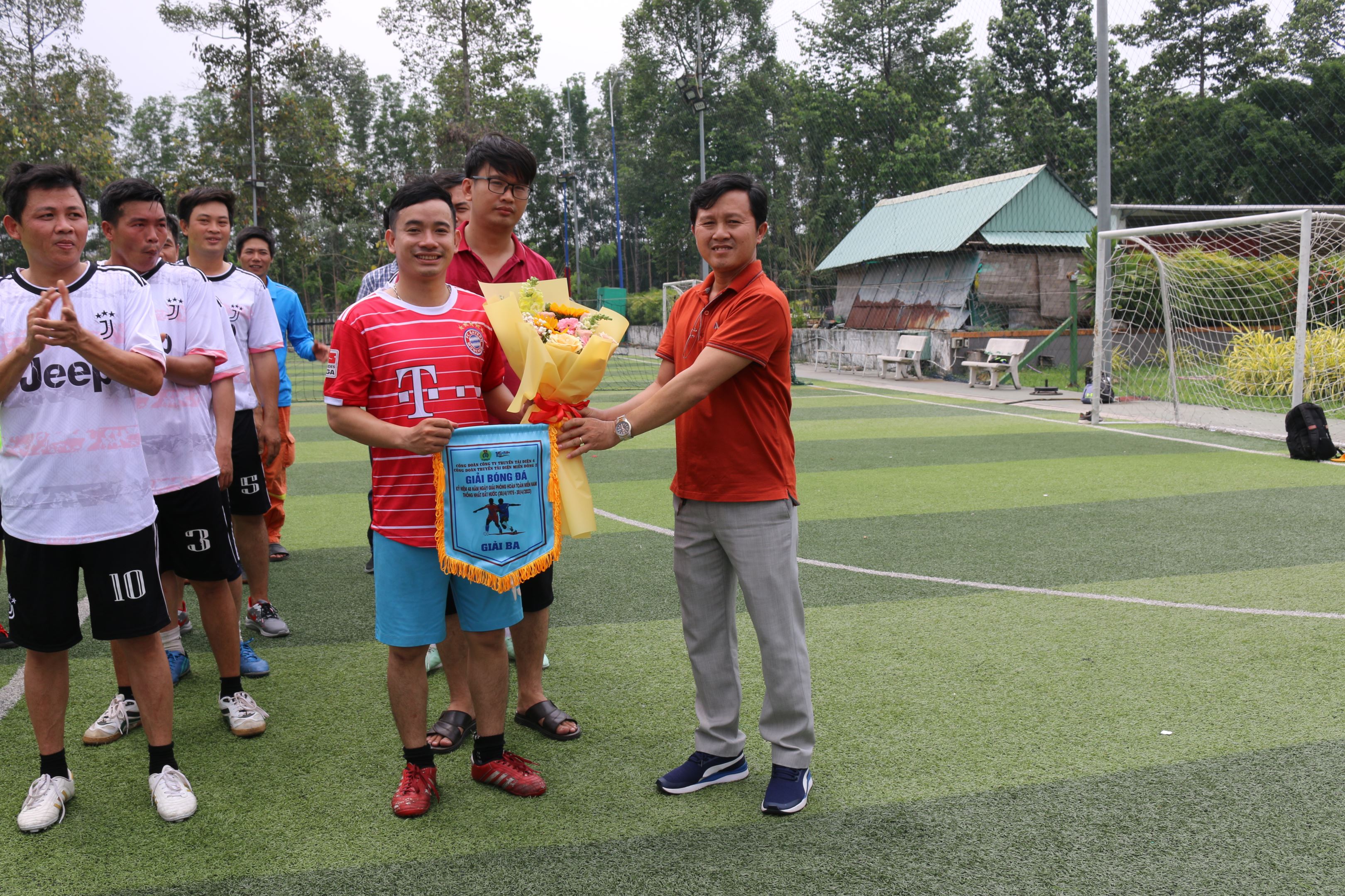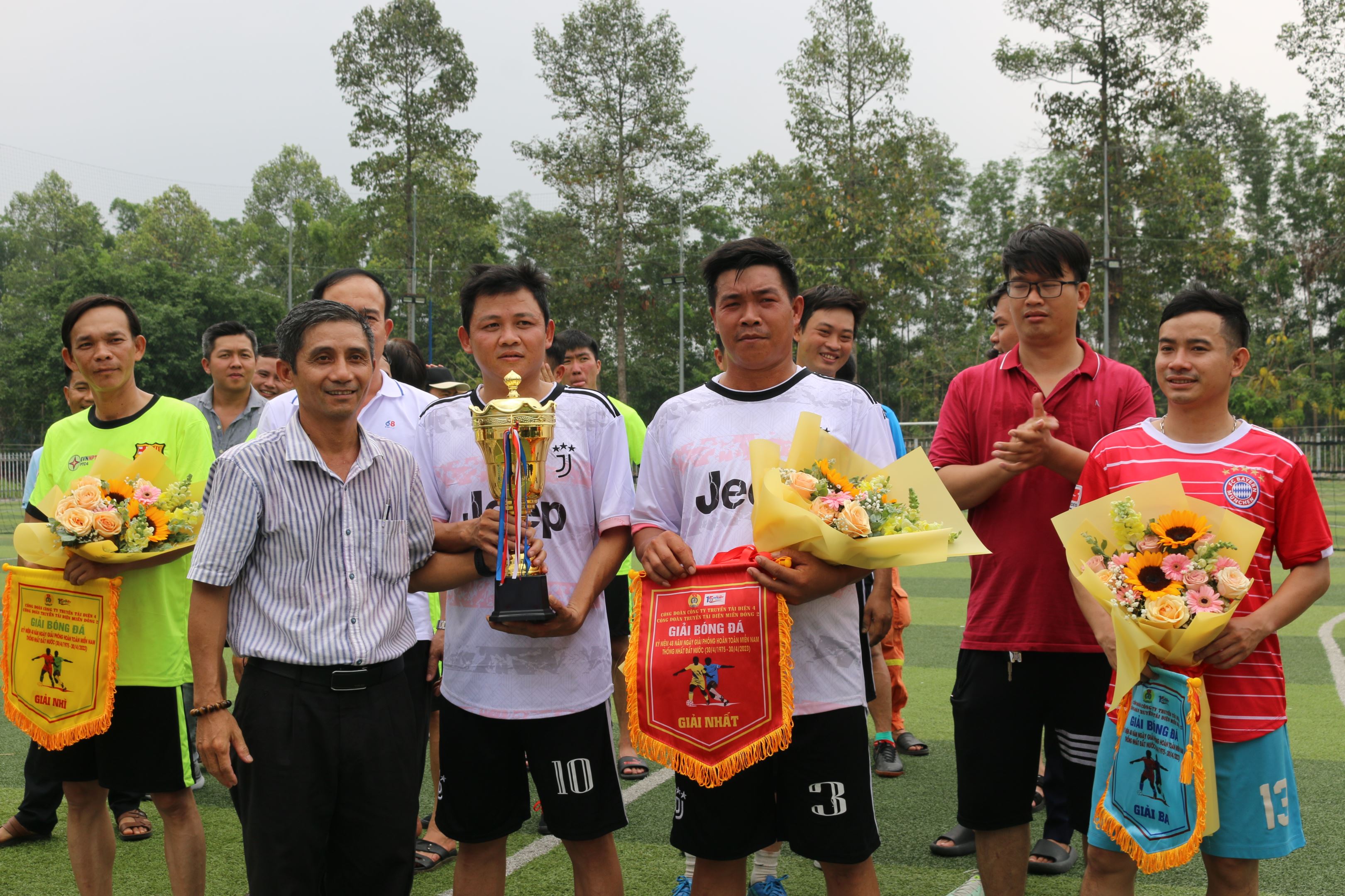 Ông Nguyễn Văn Lịch - Ủy viên Ban chấp hành công đoàn PTC4 - Phó Giám đốc TTĐMĐ2 trao hoa và cúp vô địch cho liên quan Đội TTĐ Bù Đăng.