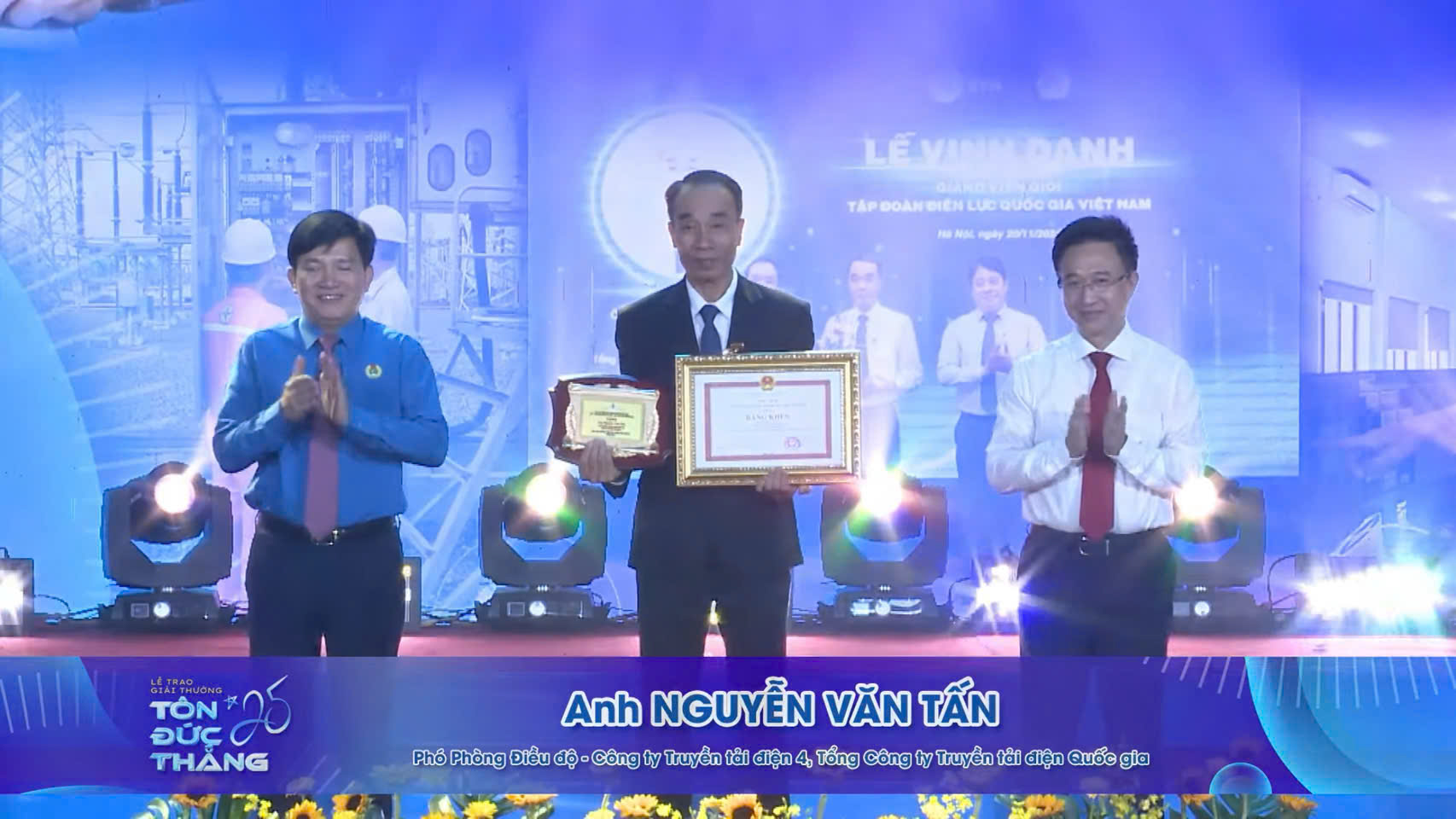 trao bằng khen và biểu trưng cho đồng chí Nguyễn Văn Tấn - Phó Phòng Điều độ - Công ty Truyền tải điện 4 đạt Giải thưởng Tôn Đức Thắng.
