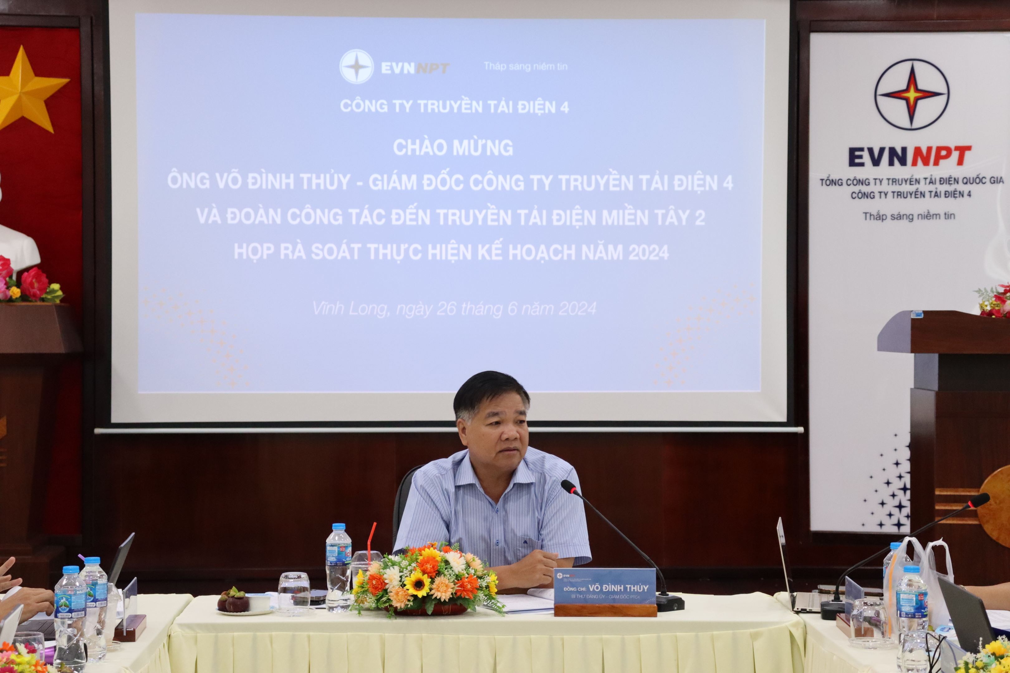 Sau báo cáo kết quả cũng như những khó khăn thách thức, những mục tiêu giải pháp cụ thể thực hiện nhiệm vụ kế hoạch của Truyền tải điện miền Tây 2, và ý kiến tham mưu của các phòng chuyên môn nghiệp vụ, Giám đốc Công ty – ông Võ Đình Thủy đã ghi nhận các nỗ lực của đơn vị trong thời gian qua, chỉ đạo các giải pháp tháo gỡ khó khăn, vướng mắc, những kiến nghị của Truyền tải điện miền Tây 2 và chỉ đạo đơn vị thực hiện các biện pháp cụ thể trong công tác quản lý vận hành như: chủ động tăng cường bay UAV kiểm tra đường dây nhằm ngăn ngừa sự cố do khiếm khuyết dây dẫn nhất là ở khu vực nhiễm mặn cao ở tỉnh Trà Vinh; rà soát xử lý các mối nguy về cây trong và ngoài hành lang; đặc biệt hiện nay lực lượng công nhân đường dây của đơn vị đang tăng cường hỗ trợ thi công dự án đường dây 500kV mạch 3 từ Quảng Trạch (Quảng Bình) đến Phố Nối (Hưng Yên) với số lượng là 37/87 công nhân đường dây, do đó đơn vị cần phải tập trung duy trì công tác vận hành lưới, không để xảy ra sự cố do chủ quan đảm bảo hệ thống truyền tải điện vận hành an toàn, liên tục và ổn định; phấn đấu hoàn thành kế hoạch năm 2024; không ngừng cải thiện điều kiện và môi trường làm việc cho cán bộ công nhân viên.