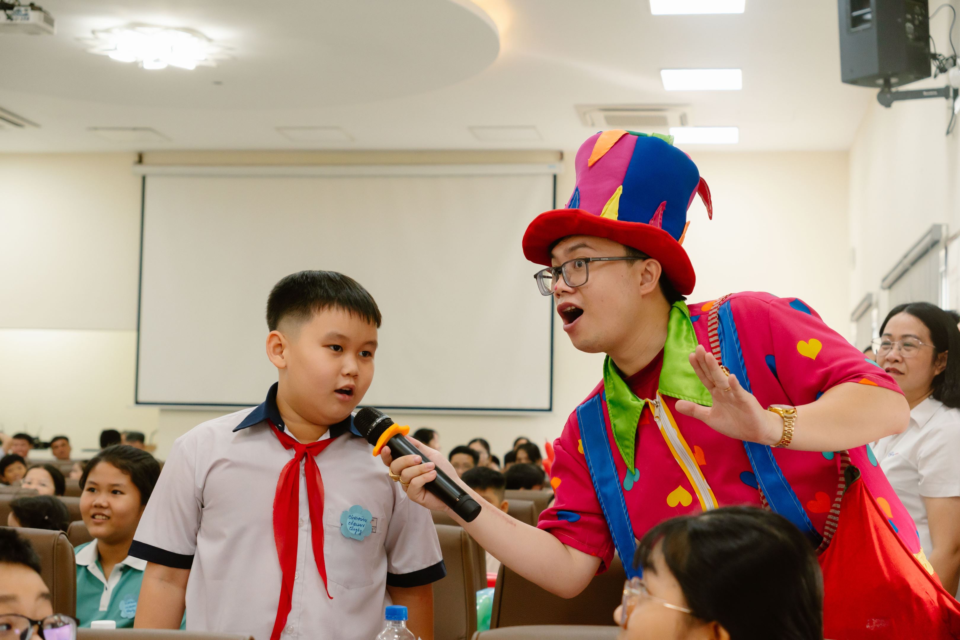Con CBCNV tham gia trả lời câu hỏi cùng Chú hề vui nhộn.