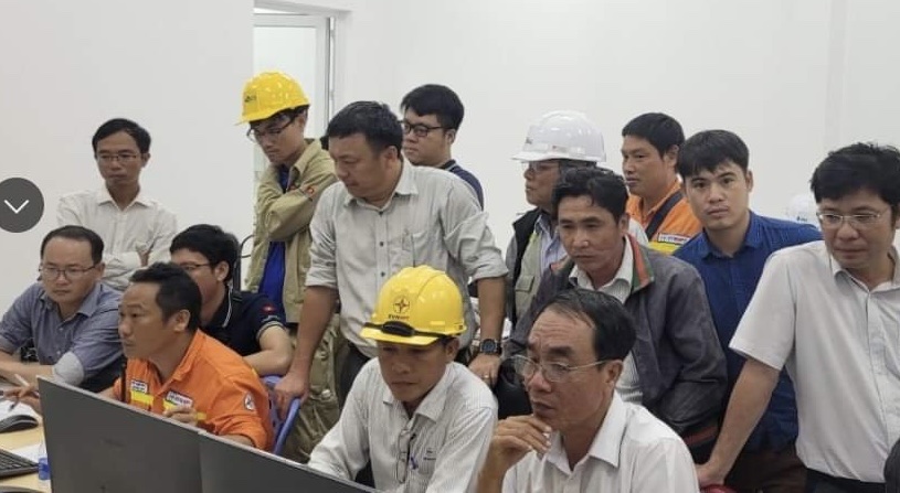 Kỹ sư Huỳnh Thanh Vũ (mặc áo trắng đội nón vàng) tham gia nghiệm thu đóng điện trạm 500kV Long Thành.