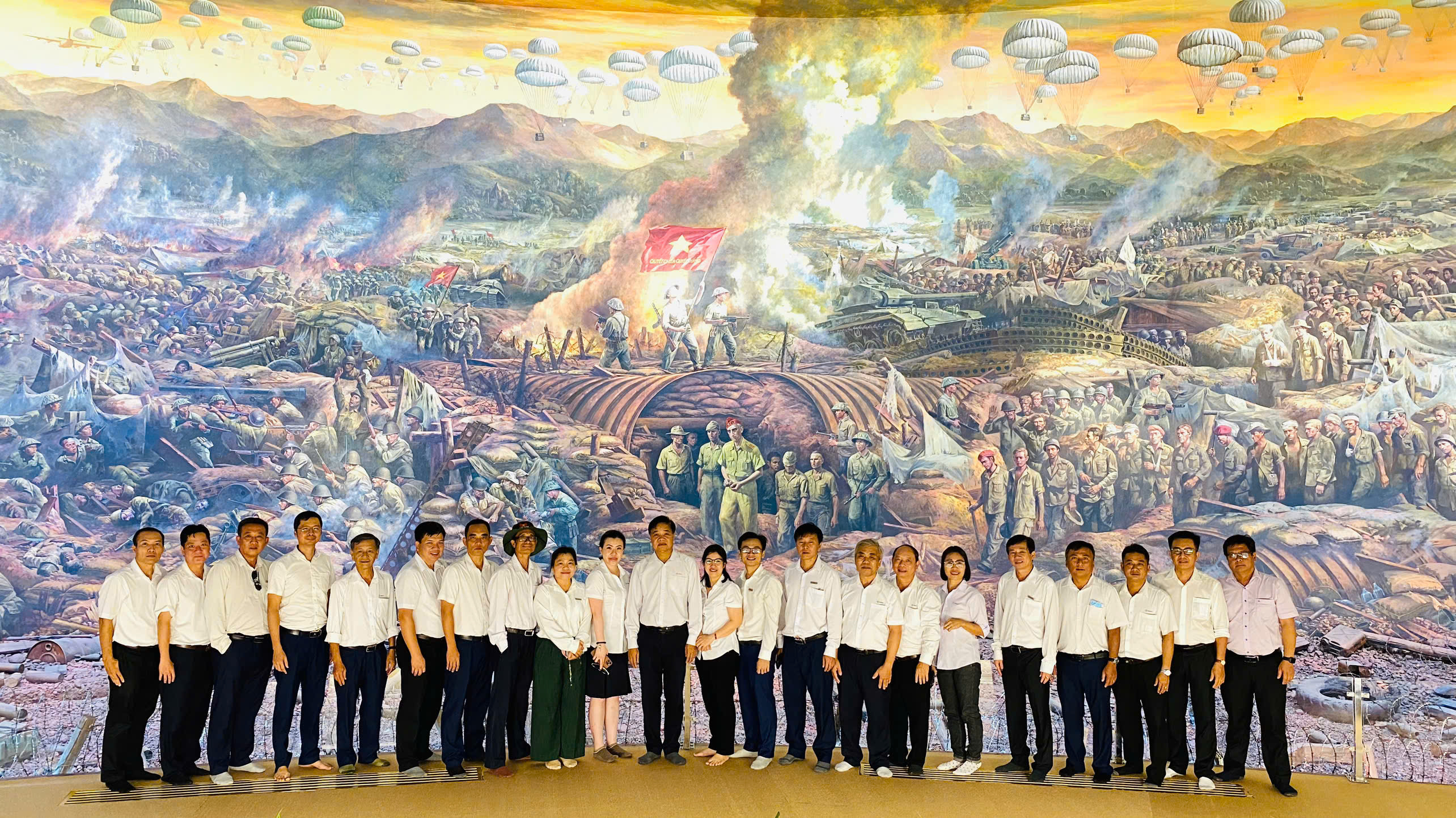 Điểm đến đầu tiên của đoàn là Bảo tàng Chiến thắng lịch sử Điện Biên Phủ, nơi lưu giữ những chứng tích sống động, tái hiện sắc nét cuộc kháng chiến chống thực dân Pháp của quân và dân ta. Từng bức tranh, khẩu pháo, đôi dép cao su sờn cũ... tất cả như còn vương mùi khói súng, đẫm mồ hôi và máu của cha ông. Một không gian hào hùng mở ra, đưa mỗi thành viên trong đoàn trở về với những tháng ngày kháng chiến gian khổ. Sự đan xen giữa quá khứ và hiện tại được thể hiện rõ nét qua bức tranh panorama toàn cảnh Chiến dịch Điện Biên Phủ rộng hơn 3.000m², tái hiện 4.500 nhân vật giữa chiến trận bi tráng trong 56 ngày đêm. Tác phẩm của hơn 200 họa sĩ dẫn dắt người xem qua 4 trường đoạn: “Toàn dân ra trận”, “Khúc dạo đầu hùng tráng”, “Cuộc đối đầu lịch sử” và “Chiến thắng lừng lẫy năm châu, chấn động địa cầu”.