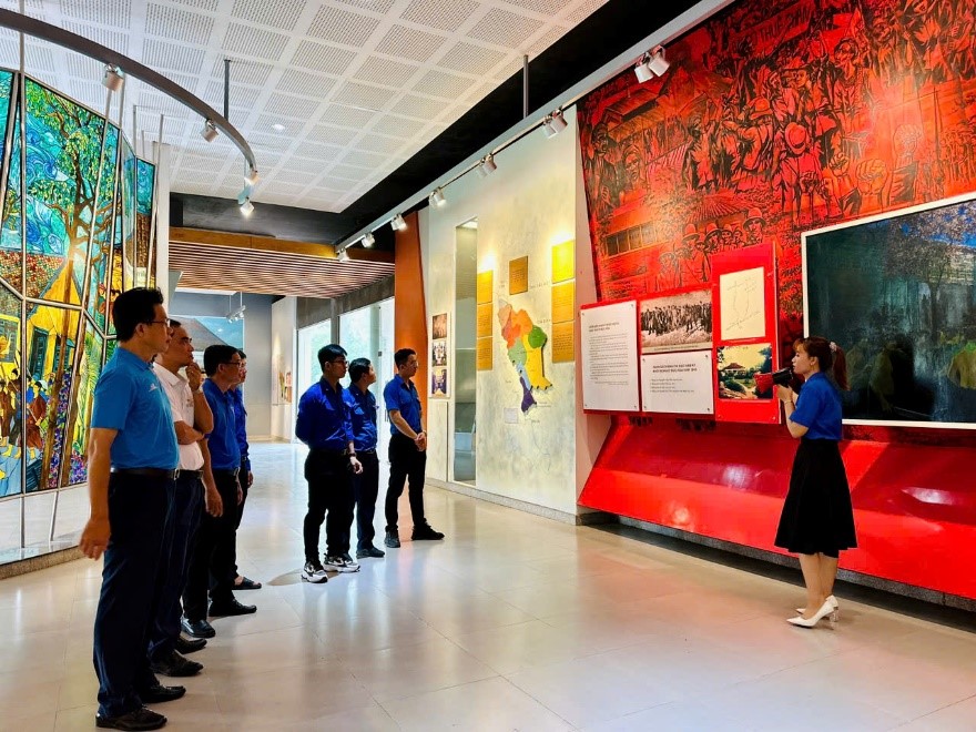 Đoàn nghe thuyết minh về thân thế cuộc đời đồng chí Võ Văn Tần tại Khu lưu niệm.
