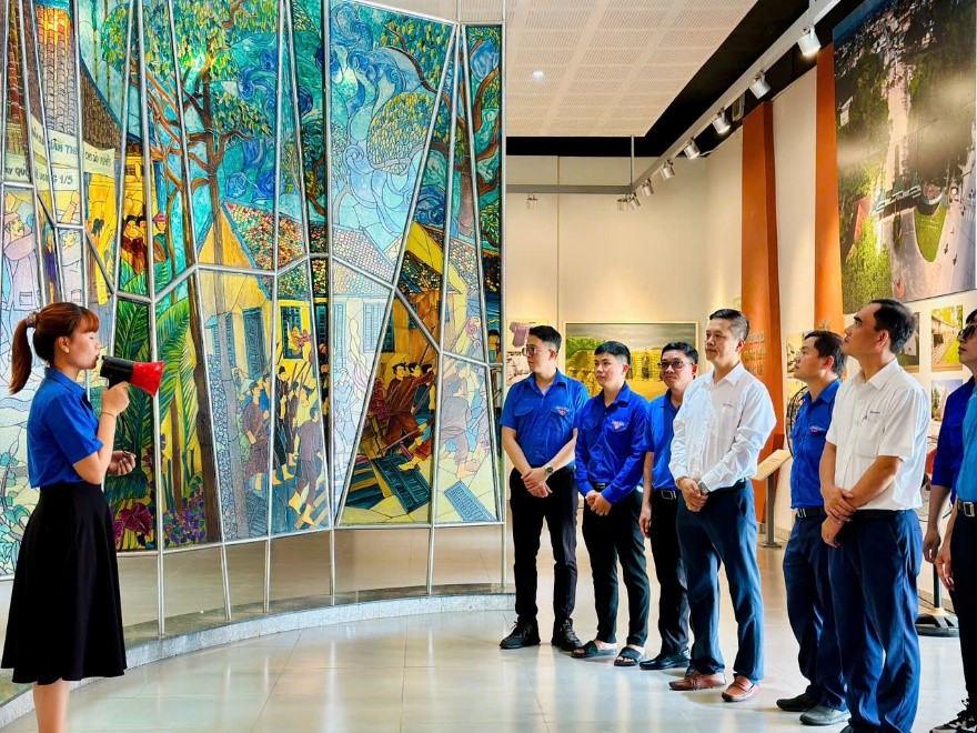 Đoàn tìm hiểu về các hiện vật trưng bày tại nhà lưu niệm của Khu di tích.