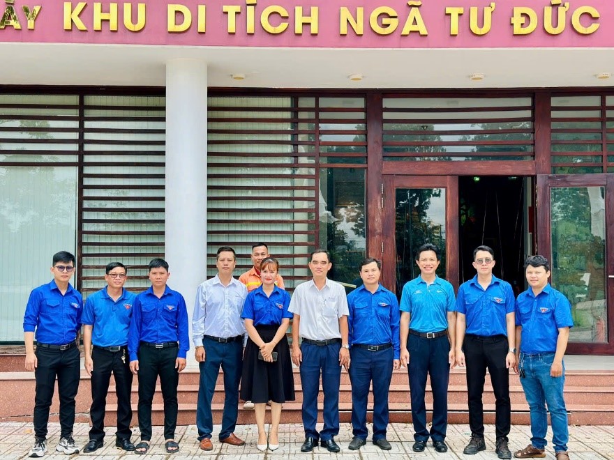 Đoàn chụp hình lưu niệm tại Di tích Ngã tư Đức Hòa - địa chỉ đỏ về lịch sử