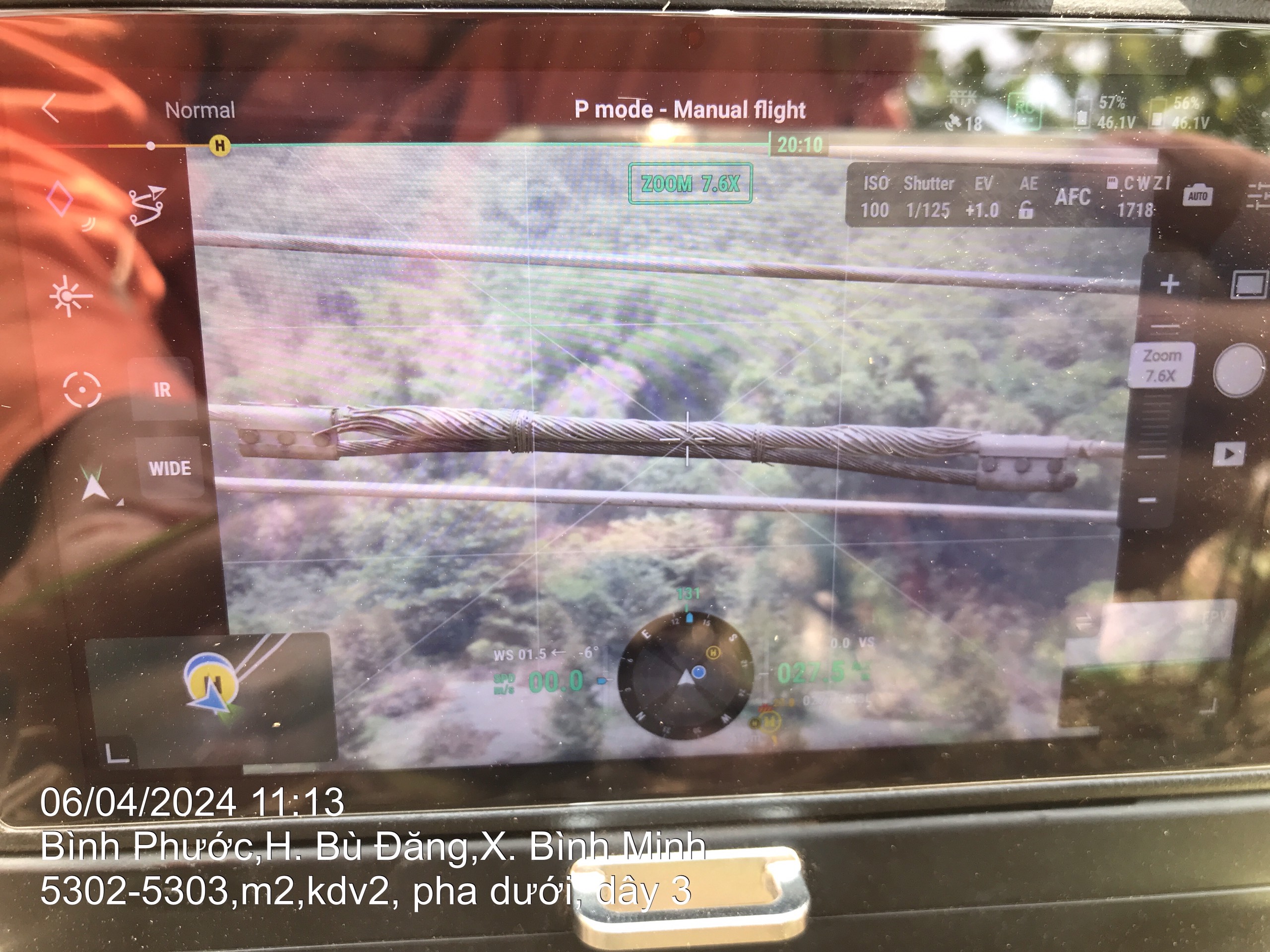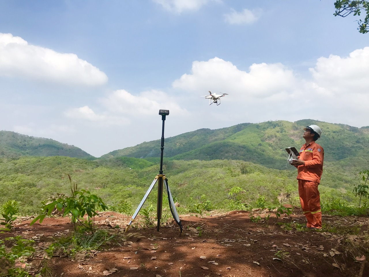 Anh Đinh Tiến Dũng - Nhân viên vận hành đường dây Đội Truyền tải điện Bù Đăng điều khiển flycam có sử dụng cây RTK kiểm tra đường dây.