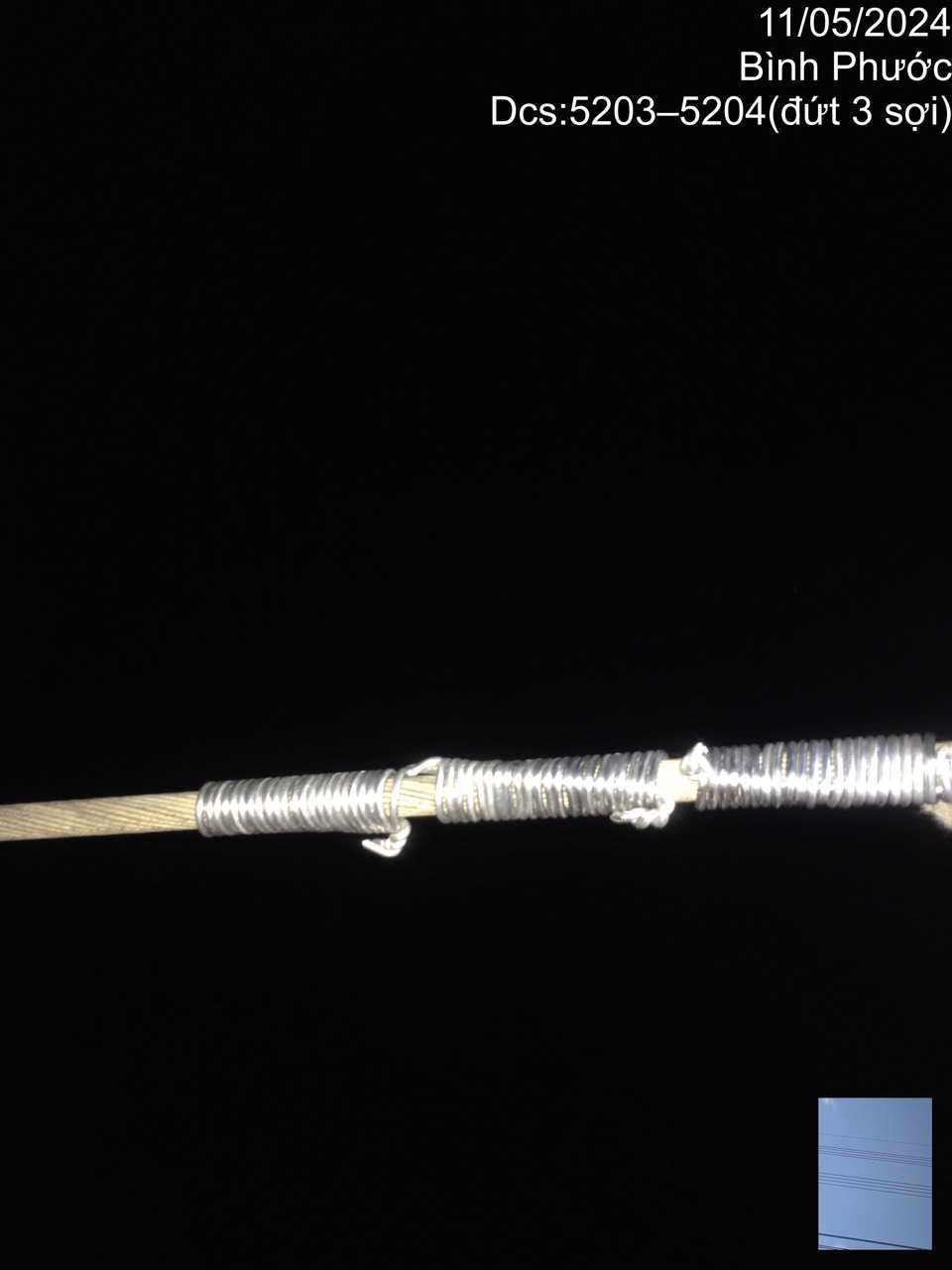 Tưa dây chống sét tại khoảng cột 598-599 (5203-5204) đường dây 500kV Xuân Thiện – EA Súp - Chơn Thành được UAV phát hiện tháng 4/2024 (đã được xử lý trong đợt cắt điện ngày 11-12/5/2024).