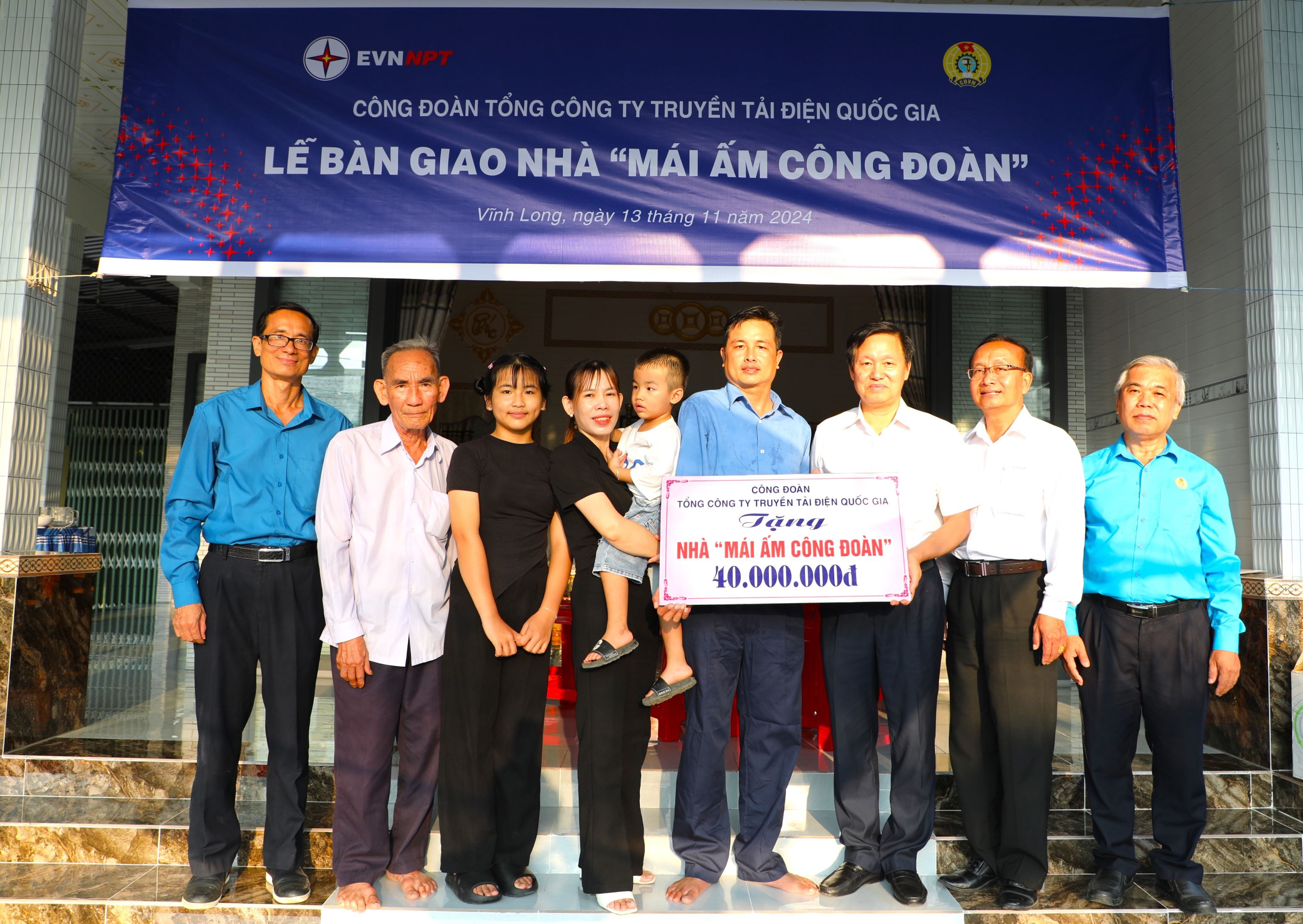 Đến trao nhà “Mái ấm công đoàn”có sự hiện diện Ông Trịnh Tuấn Sơn,UVBTV Công đoàn Điện lực Việt Nam, Chủ tịch Công đoàn EVNNPT; ÔngNguyễn Phương Nam, Chủ tịch Công đoàn PTC4, ÔngTrần Nhật Trung, Chủ tịch Công đoàn Truyền tải điện miền Tây 1.
