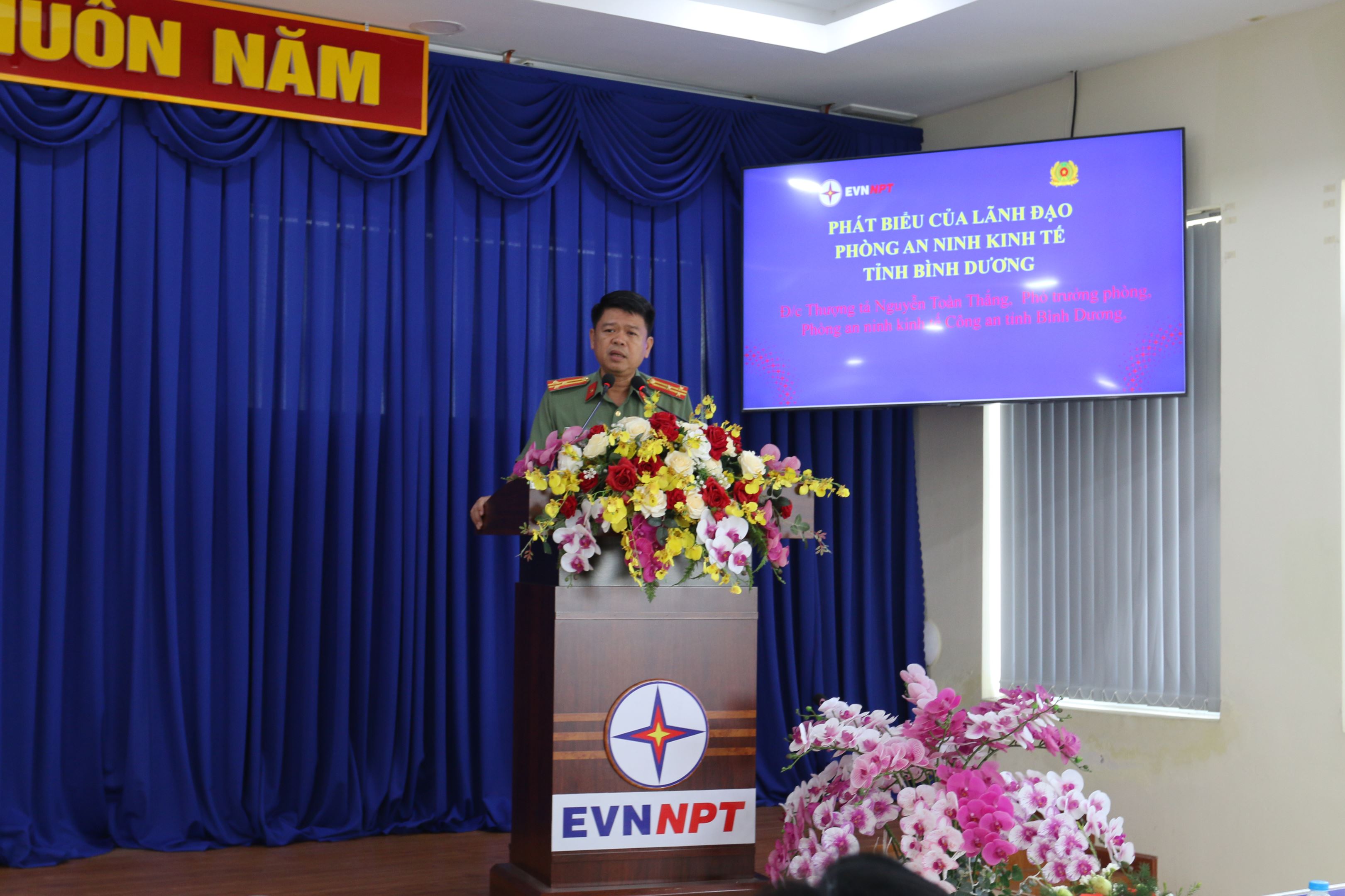 Đ/c Thượng tá Nguyễn Toàn Thắng - Phó trưởng phòng An ninh kinh tế - Công an tỉnh Bình Dương phát biểu tại Hội nghị.