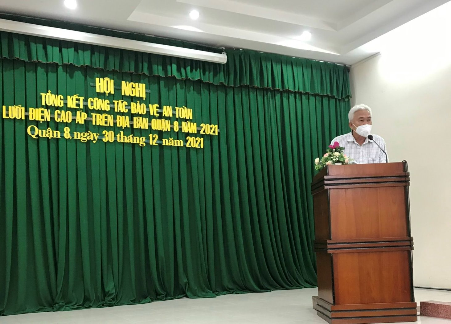 Thay mặt đơn vị quản lý vận hành, ông Nguyễn Quang Thảo - Phó Giám đốc TTĐHCM báo cáo kết quả thực hiện công tác bảo vệ hành lang an toàn lưới điện cao áp năm 2021 và phương hướng nhiệm vụ trong năm 2022. Theo bao cáo, Lãnh đạo UBND Quận 8 và các ban ngành địa phương đã quan tâm điều hành chỉ đạo, phối hợp bằng các văn bản thiết thực trong công tác thông tin tuyên truyền, phổ biến pháp luật về bảo vệ hành lang an toàn lưới điện cao áp, tăng cường công tác kiểm tra nhằm kịp thời ngăn chặn các trường hợp có hành vi vi phạm ngay từ ban đầu. Năm 2021, trên địa bàn Quận 8 không có trường hợp vi phạm nào để xảy ra vi phạm HLATLĐCA và nguy cơ sự cố lưới điện. Về phương hướng nhiệm vụ trong năm 2022, đơn vị quản lý vận hành sẽ phát huy kết quả đạt được của năm 2021 trong công tác phối hợp với các cơ quan, ban, ngành địa phương, thường xuyên kiểm tra nhằm phát hiện, xử lý kịp thời không để xảy ra các trường hợp vi phạm hành lang lưới điện; Phối hợp với các đơn vị quản lý lưới điện tuyên truyền trong nhân dân bảo vệ an toàn lưới điện cao áp bằng các hình thức phát tờ rơi, dán decal, phát thanh về Nghị định 134/2013/NĐ-CP ngày 17/10/2013 của Chính phủ quy định về xử phạt vi phạm hành chính trong lĩnh vực điện lực, an toàn đập thủy điện, sử dụng năng lượng tiết kiệm và hiệu quả; Nghị định 14/2014/NĐ-CP ngày 26/02/2014 của Chính phủ quy định chi tiết thi hành Luật Điện lực về bảo vệ an toàn điện, Nghị định 51/2020/NĐ-CP của Chính phủ về việc sửa đổi, bổ sung một số điều của Nghị định 14/2014/NĐ-CP ngày 26/02/2014 của Chính phủ quy định chi tiết thi hành Luật Điện lực về an toàn điện, …