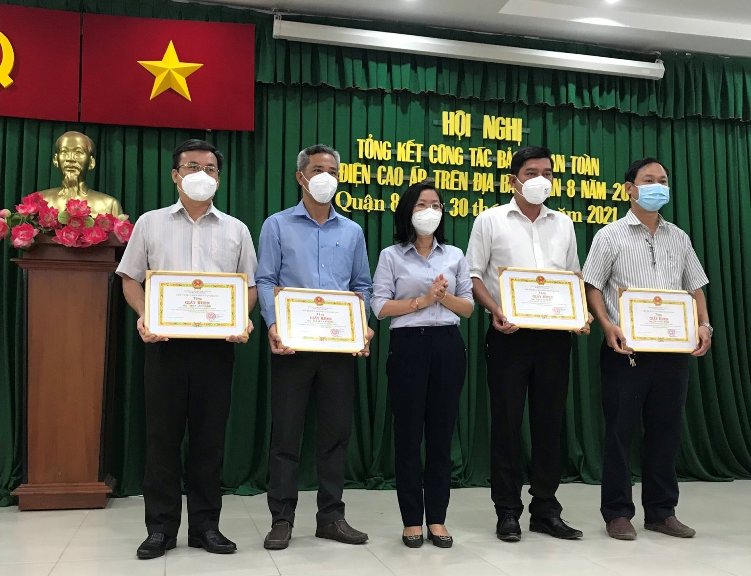 Tại Hội nghị, TTĐHCM phối hợp với UBND Quận 8 khen thưởng cho 02 tập thể, 05 cá nhân có thành tích tích cực trong công tác bảo vệ hành lang an toàn lưới điện cao áp trên địa bàn Quận 8 trong năm 2021.
