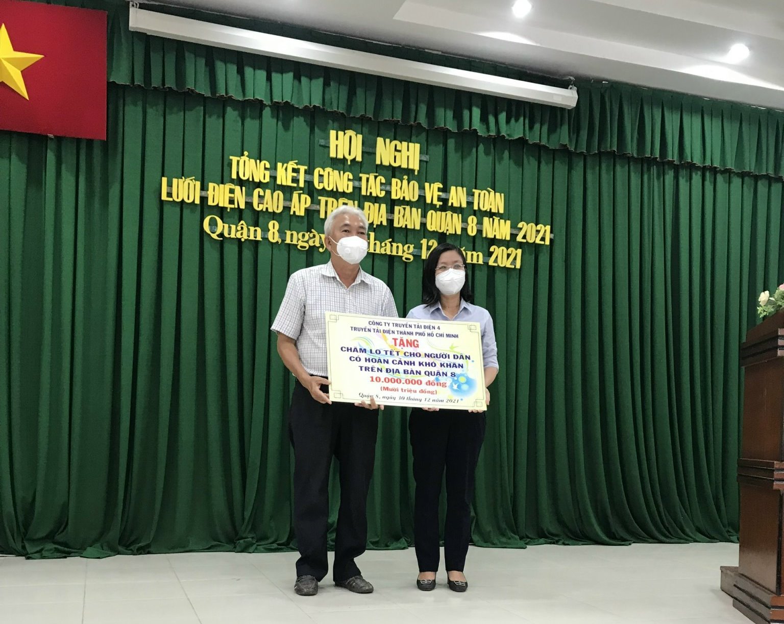 Nhân Hội nghị tổng kết công tác BVHLATLĐCA trên địa bàn Quận 8, cũng như nhân Tháng tri ân khách hàng, thông qua sự trao đổi, thống nhất giữa chính quyền địa phương và đơn vị quản lý vận hành, Truyền tải điện Thành phố Hồ Chí Minh thay mặt Công ty Truyền tải điện 4 trao tặng 10 phần quà góp phần cùng địa phương chăm lo Tết cho người dân có hoàn cảnh khó khăn trên địa bàn Quận 8. Qua đó, đơn vị quản lý vận hành cảm ơn sự phối hợp tốt của các cơ quan, ban ngành và chính quyền địa phương Quận 8 trong công tác bảo vệ an toàn lưới điện cao áp./.