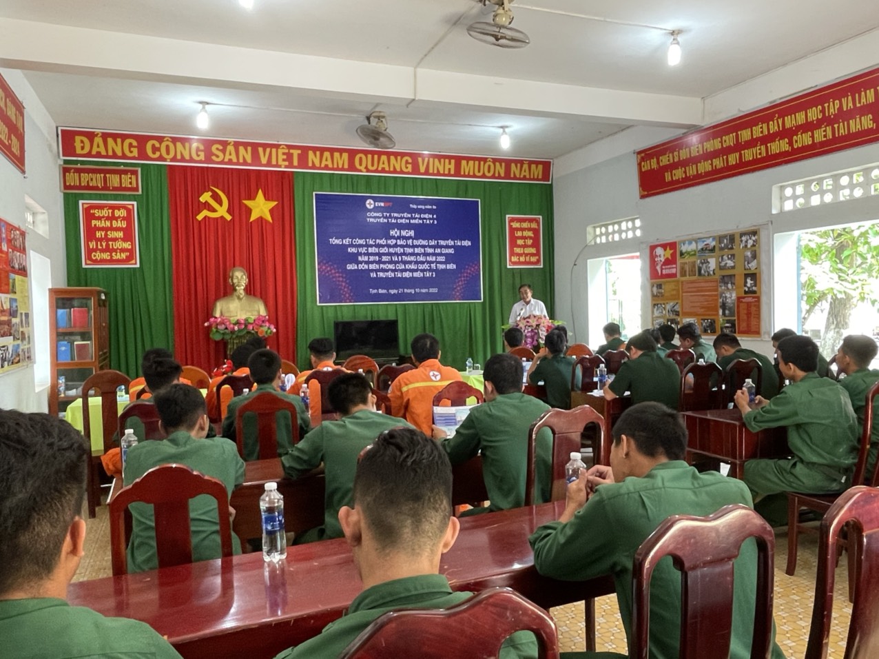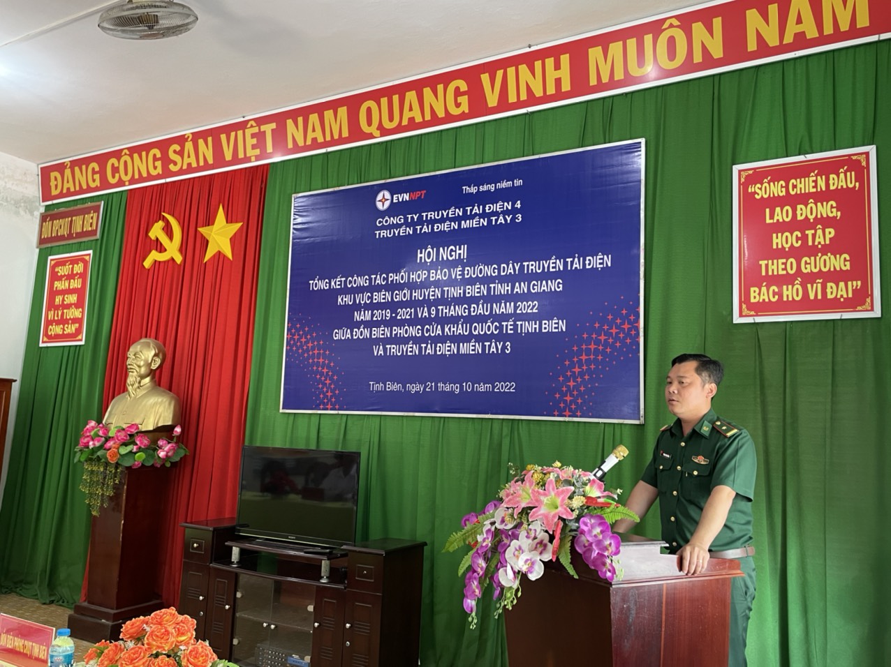 Thực hiện theo phương án phối hợp bảo vệ đường dây truyền tải điện tại khu vực biên giới huyện Tịnh Biên, tỉnh An Giang. Sáng ngày 21/10/2022, tại Hội trường Đồn biên phòng cửa khẩu Quốc tế Tịnh Biên (ĐBPCKQTTB), Truyền tải điện Miền Tây 3 (TTĐMT3) đã phối hợp với Đồn biên phòng cửa khẩu Quốc tế Tịnh Biên tổ chức Hội nghị tổng kết công tác bảo vệ đường dây truyền tải điện năm 2019 - 2021 và 09 tháng đầu năm 2022 tại khu vực biên giới huyện Tịnh Biên.