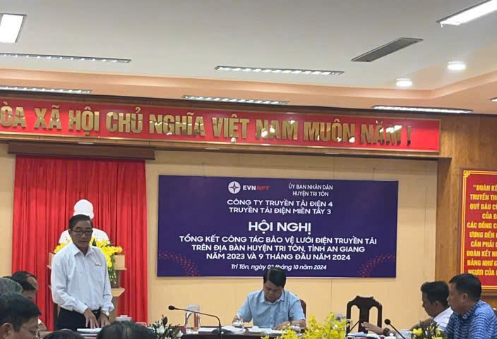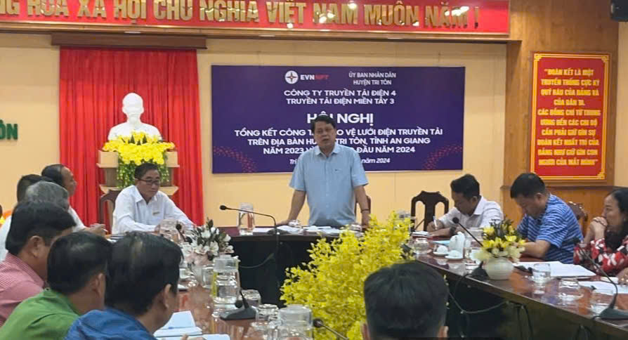 Tại hội nghị, Ông. Huỳnh Thế Vinh – Đội trưởng Đội Truyền tải điện Châu Đốc đã trình bày báo cáo tổng kết công tác bảo vệ hành lang an toàn lưới điện cao áp trên địa bàn tỉnh An Giang và huyện Tri Tôn, nêu lên những thuận lợi và khó khăn trong công tác bảo vệ hành lang an toàn lưới truyền tải điện trong năm 2023 và 09 tháng năm 2024 trên địa bàn huyện và một số phương hướng tiếp theo cho công tác bảo vệ hành lang an toàn lưới truyền tải điện trong năm 2024 và những năm tiếp theo.