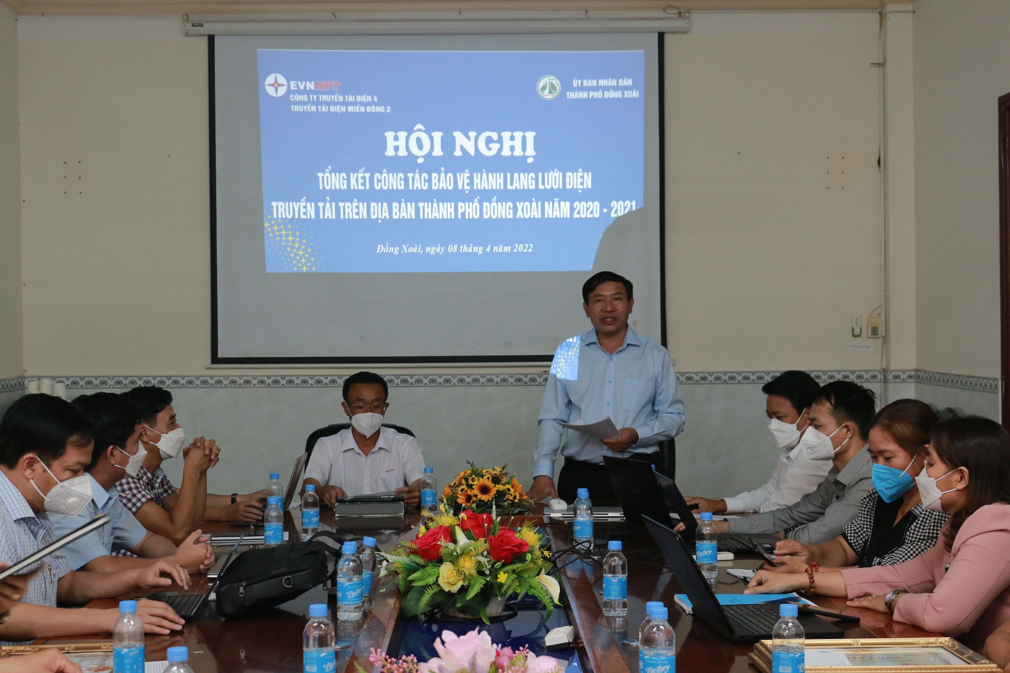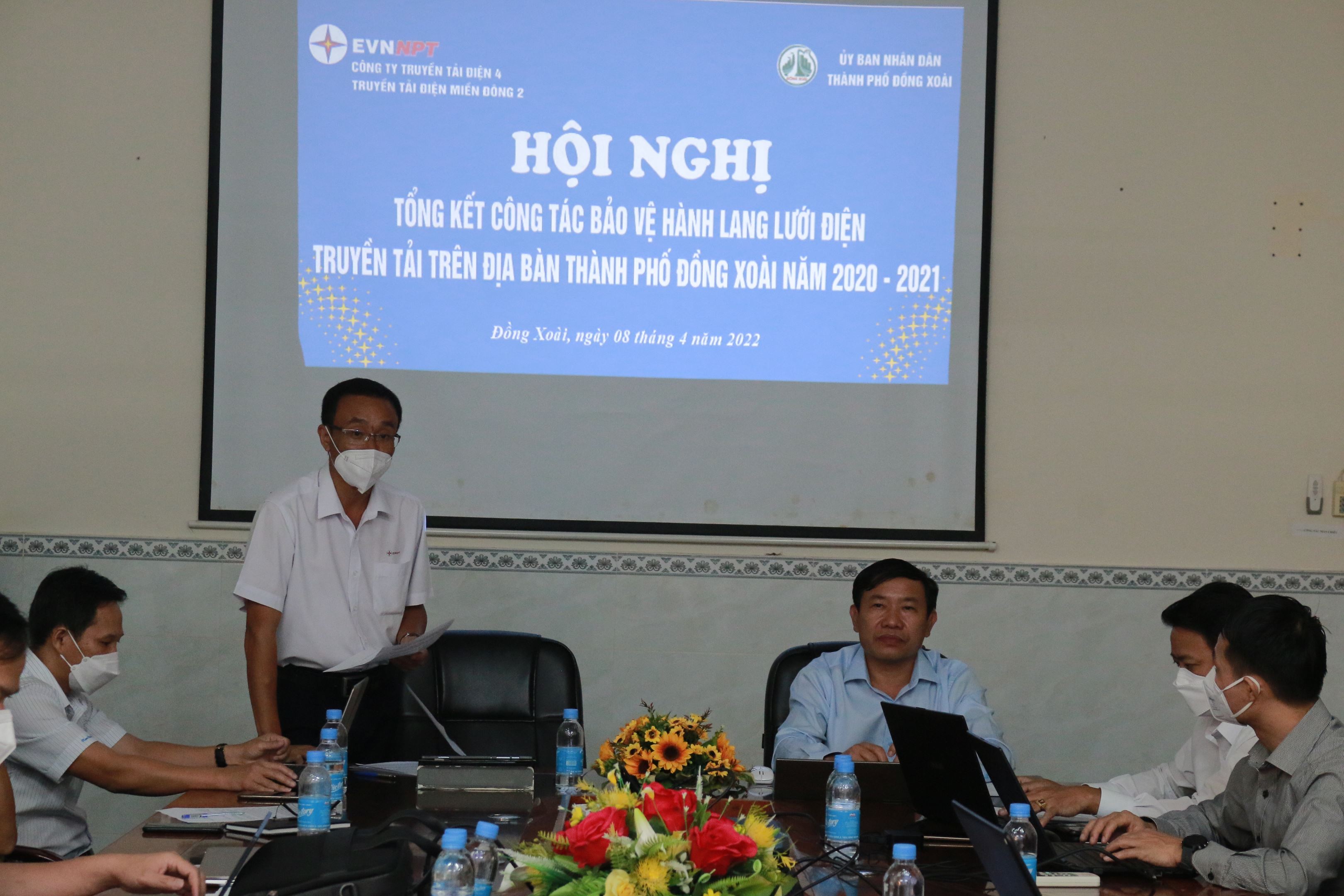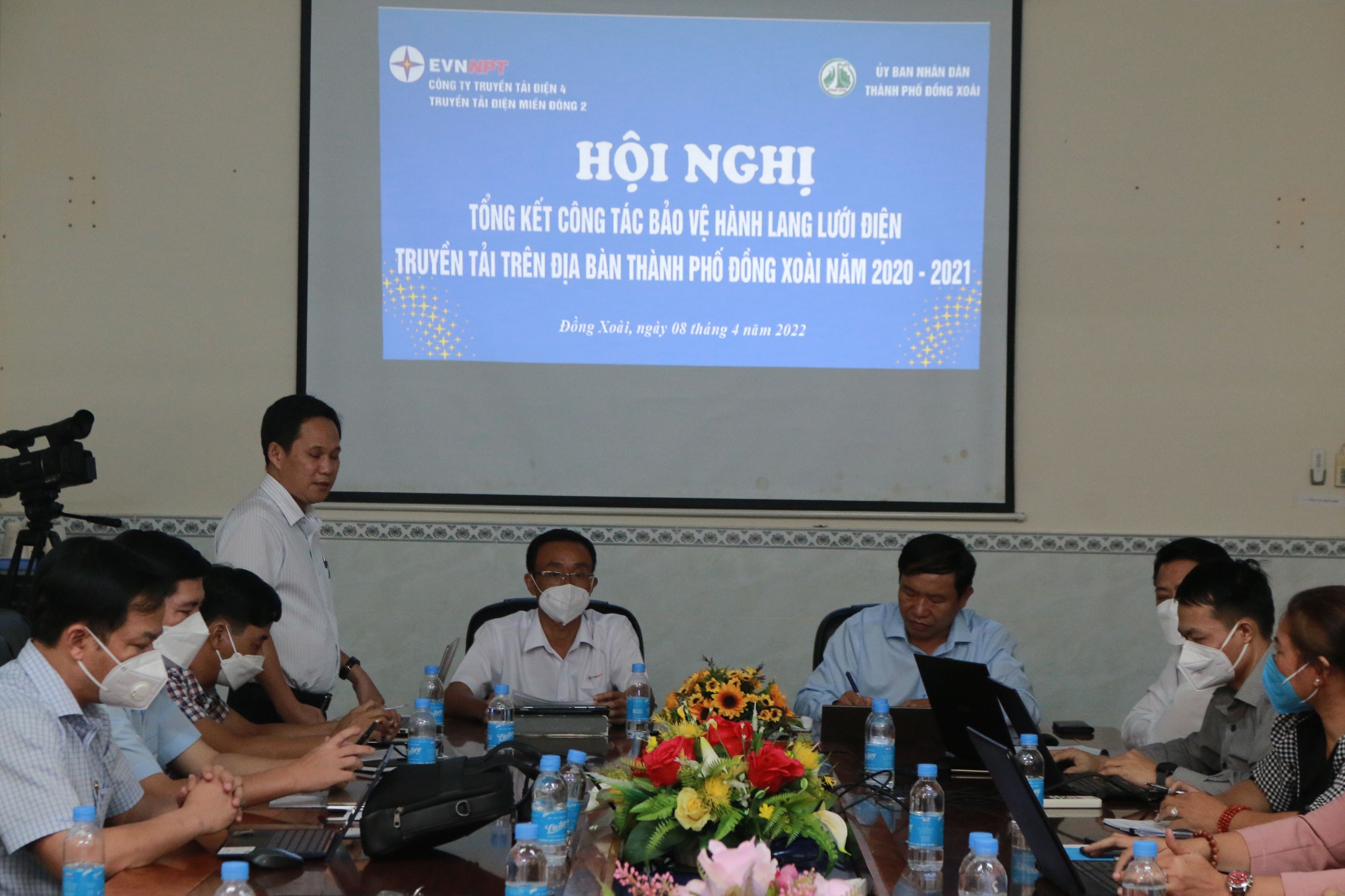 Tại Hội nghị, ông Nguyễn Việt Dũng - Trưởng Phòng kinh tế hạ tầng của UBND Tp Đồng Xoài thay mặt cho UBND TP. Đồng Xoài, tỉnh Bình Phước đã báo cáo: Hệ thống lưới điện cao áp do đơn vị TTĐMĐ2 quản lý trên địa bàn huyện có 01 Đường dây 500kV Đắk Nông – Cầu Bông đi qua 3 xã, phường. Trong giai đoạn năm 2020 - 2021, công tác quản lý, xử lý vi phạm hành lang an toàn lưới điện cao áp (HLATLĐCA) đã được UBND các cấp, ngành quan tâm chỉ đạo, xử lý kiên quyết; đơn vị quản lý vận hành lưới điện tích cực phối hợp với các xã, phường trên địa bàn huyện trong việc xử lý vi phạm HLATLĐCA đã giải quyết cơ bản các trường hợp nhà, công trình vi phạm hành lang bảo vệ an toàn lưới điện cao áp; thường xuyên tăng cường tuyên truyền các quy định của pháp luật và thông báo cảnh báo vi phạm HLATLĐCA đến các hộ dân sống dọc đường dây để người dân biết và thực hiện. Tổ chức phát tờ rơi tuyên truyền các văn bản pháp luật liên quan đến công tác bảo vệ an toàn lưới điện cho người dân dọc tuyến đường dây, học sinh trong các Trường học trên địa bàn Tp Đồng Xoài; tính đến thời điểm hiện tại đã chằng néo 07 nhà, công trình ở gần hành lang đường dây 500kV Đắk Nông– Cầu Bông có nguy cơ bị gió lốc cuốn vào đường dây thuộc hai phường Tân Xuân, Tân Thiện, đồng thời vận động người dân tự chằng néo 02 nhà, công trình, lắp đặt 04 pano tuyên truyền,18 biển cảnh báo vượt đường bộ, biển cấm lửa, biển hướng dẫn công tác bảo vệ an toàn lưới điện cao áp. Thực hiện vận động người dân ký được 92 bản cam kết bảo vệ hành lang an toàn lưới điện, phát 420 tờ rơi tuyên truyền các loại, tặng 400 cuốn tập cho các học sinh nghèo tại các trường học trên địa bàn xã Tiến Hưng.