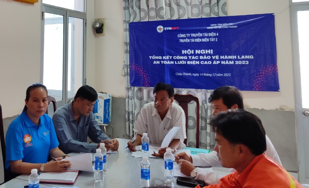 Tại hội nghị, ông Trần Tấn Hùng đã trình bày báo cáo tổng kết công tác bảo vệ hành lang an toàn lưới điện cao áp tại khu vực huyện Châu Thành, tỉnh Bến Tre. Trên địa bàn huyện có tuyến đường dây 220kV Mỹ Tho 2 – Bến Tre (2 mạch) từ cột 24 đến cột 43, đi qua xã An Khánh và xã Tam Phước, tổng chiều dài là 6,858 km (20 cột). Trong năm 2023, công tác phối hợp giữa ngành điện với các ban ngành huyện Châu Thành nói chung và Ủy ban nhân dân các xã có đường dây truyền tải điên đi qua nói riêng được duy trì thường xuyên, công tác tuyên truyền trong nhân dân được phổ biến rộng rãi, hiệu quả góp phần vào công tác đảm bảo lưới điện vận hành an toàn, liên tục, ổn định. Cụ thể: không có xảy ra sự cố do vi phạm hành lang, mất cắp, tháo gỡ phụ kiện lưới điện, không thả diều, ném các vật gây sự cố cho đường dây, trạm điện, không sử dụng các phương tiện thi công gây chấn động mạnh hoặc gây hư hỏng cho công trình lưới điện,...Đây là nổ lực rất lớn của các ban ngành địa phương, đơn vị quản lý vận hành, trong việc phối hợp tuyên truyền, vận động nhân dân nghiêm chỉnh chấp hành các quy định của Nhà nước về bảo vệ hành lang an toàn lưới điện.