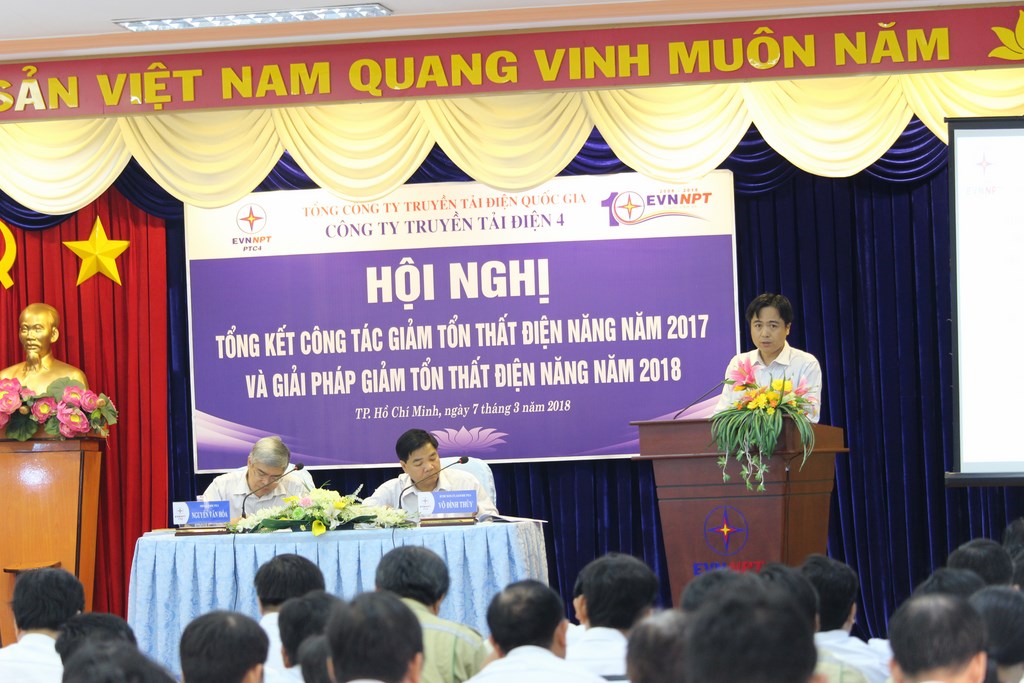 Mở đầu Hội nghị, ông Trương Hữu Thành, Trưởng phòng Kỹ thuật Công ty trình bày báo cáo tổng kết, đánh giá giảm tổn thất điện năng năm 2017 và phương hướng năm 2018. Các đơn vị Truyền tải điện báo cáo kết quả thực hiện các giải pháp đã xác định trong hội nghị giảm tổn thất điện năng năm 2017, các nội dung chưa làm được, nguyên nhân và biện pháp khắc phục; đề xuất các giải pháp nhằm giảm tổn thất điện năng lưới điện. Ngoài ra, các đơn vị Truyền tải điện miền Đông 1, Truyền tải điện miền Đông 2 và Truyền tải điện TP. Hồ Chí Minh đã báo cáo các tham luận như : Công tác giám sát, đánh giá các ảnh hưởng của tình trạng cosφ thấp trong lưới 110kV lên tổn thất điện năng lưới truyền tải điện; các giải pháp cải thiện của Truyền tải điện Miền đông 1; Đánh giá ảnh hưởng của sơ đồ kết dây lưới 110kV khu vực Tây Ninh – Bình Long đến tình hình đầy tải, quá tải làm ảnh hưởng lên tổn thất điện năng lưới truyền tải điện của Truyền tải điện Miền đông 2; Ước lượng số liệu tổn thất điện năng phần tử (đường dây, máy biến áp) bất hợp lý, đánh giá ảnh hưởng lên tổn thất điện năng lưới truyền tải điện của Truyền tải điện miền Tây 1.