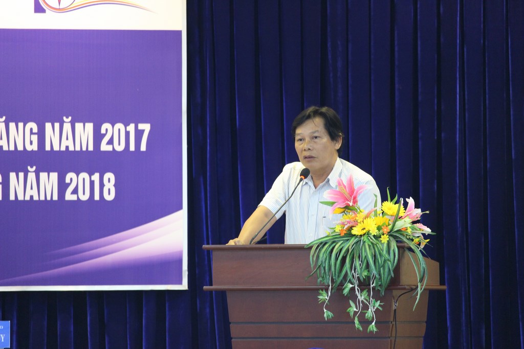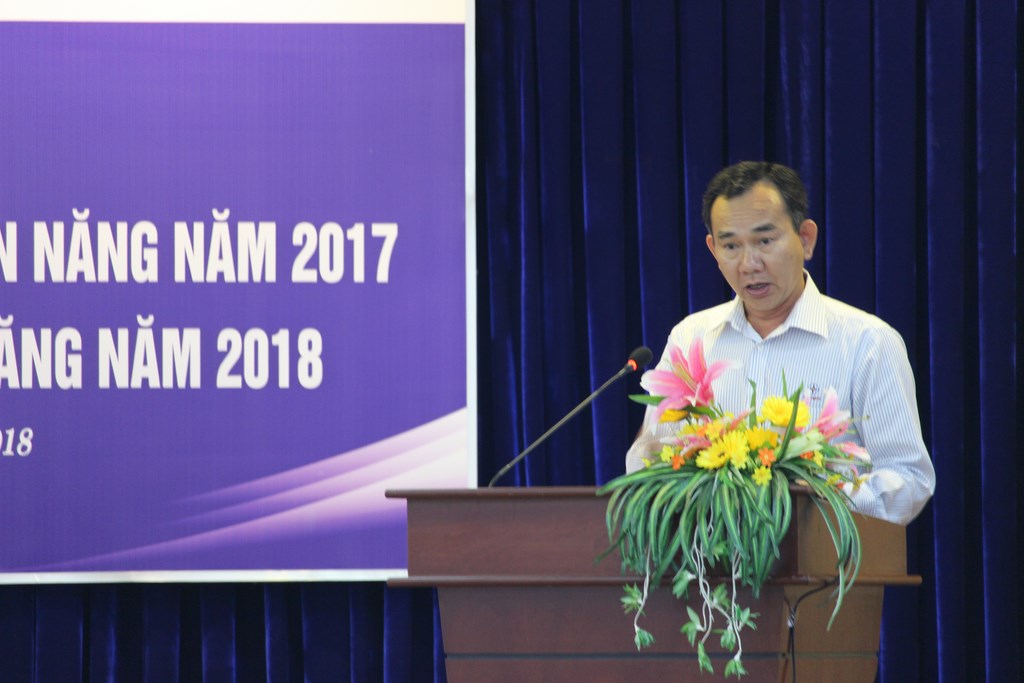 Ông Trương Hữu Thành, Trưởng phòng Kỹ thuật trình bày báo cáo tổng kết, đánh giá giảm tổn thất điện năng năm 2017 và phương hướng năm 2018.