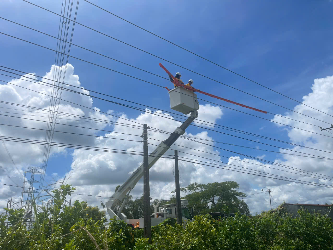 Công nhân Công ty Điện lực Vĩnh Long thực hiện bọc hotline đường dây trung thế giao chéo tại khoảng cột 104 - 105 đường dây 500kV Duyên Hải – Mỹ Tho để đảm bảo an toàn thi công.