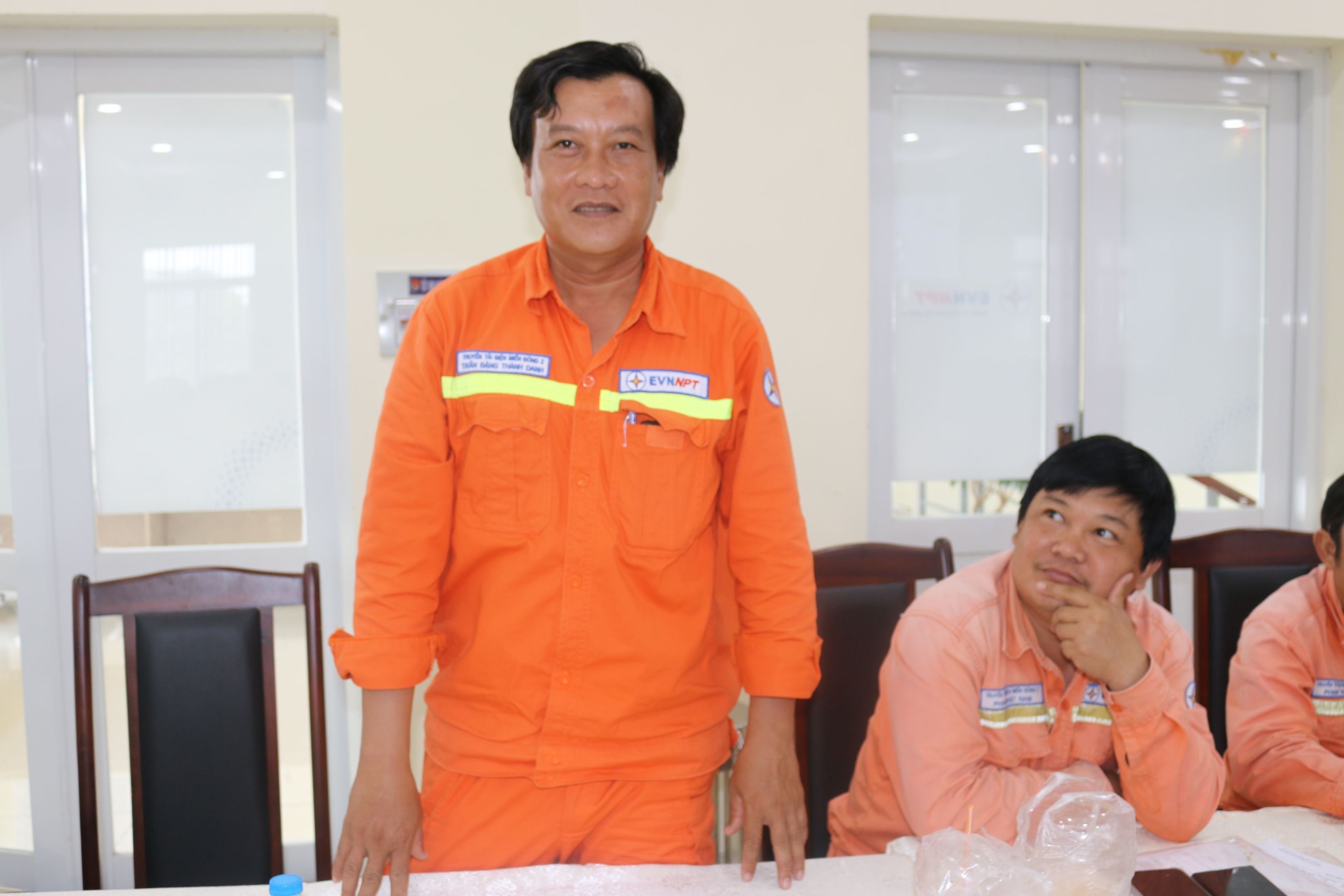 Anh Đặng Thành Danh- Công nhân kỹ thuật Đội Truyền tải điện Tây Ninh trao đổi tại lớp học.