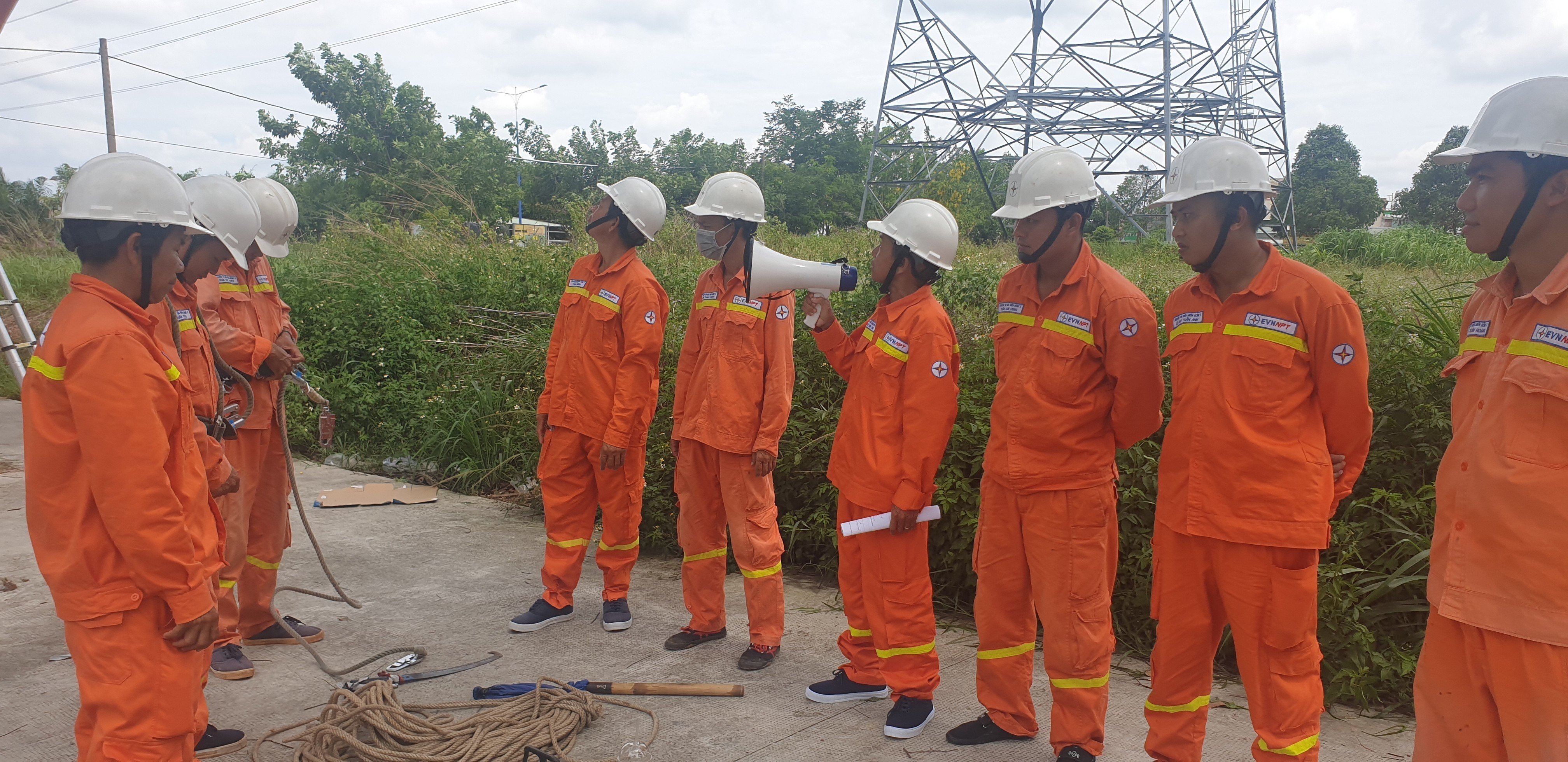 Anh Bùi Văn Thân- Công nhân kỹ thuật Đội Truyền tải điện Đồng Xoài phổ biến phương án trước khi thực hành chặt cây.