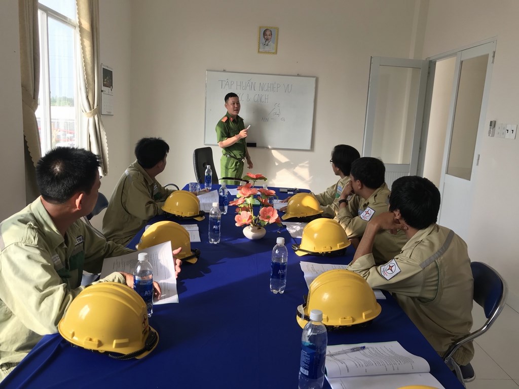 Cán bộ PCCC hướng dẫn lý thuyết kiến thức về PCCC&CNCH cho CBCNV Trạm Long Xuyên 2.