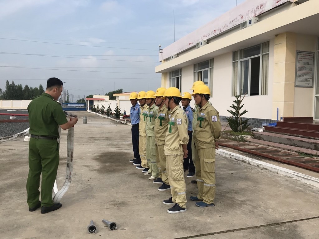 CBCNV trạm Long Xuyên 2 thực hành xử lý cháy xăng dầu.