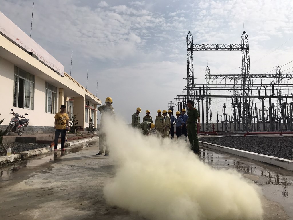 Ngày tiếp theo, các học viên được thực hành diễn tập tình huống giả định là cháy máy biến áp 250MVA trong trạm. Tình huống giả định đặt ra là với lượng dầu lớn 63 tấn trong máy biến áp, lửa to không thể dập tắt được, nhân viên vận hành trạm phải gọi điện đường dây nóng nhờ sự hỗ trợ của cảnh sát PCCC và CNCH thành phố Long Xuyên, tình huống cũng giả định trong quá trình chữa cháy có 02 cán bộ bị thương. Cảnh sát PCCC và CNCH đã có mặt kịp thời với 20 chiến sĩ cùng 3 xe chữa cháy và các dụng cụ chuyên dùng, lực lượng cảnh sát PCCC và CNCH phối hợp nhân viên vận hành trạm khống chế được đám cháy và cứu hộ được 02 người bị nạn theo tình huống nêu ra.