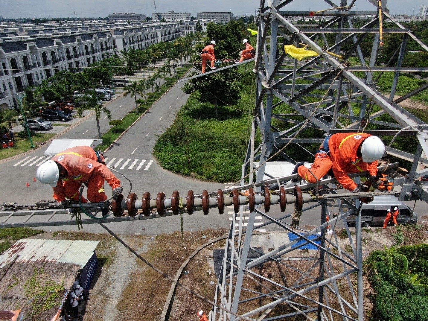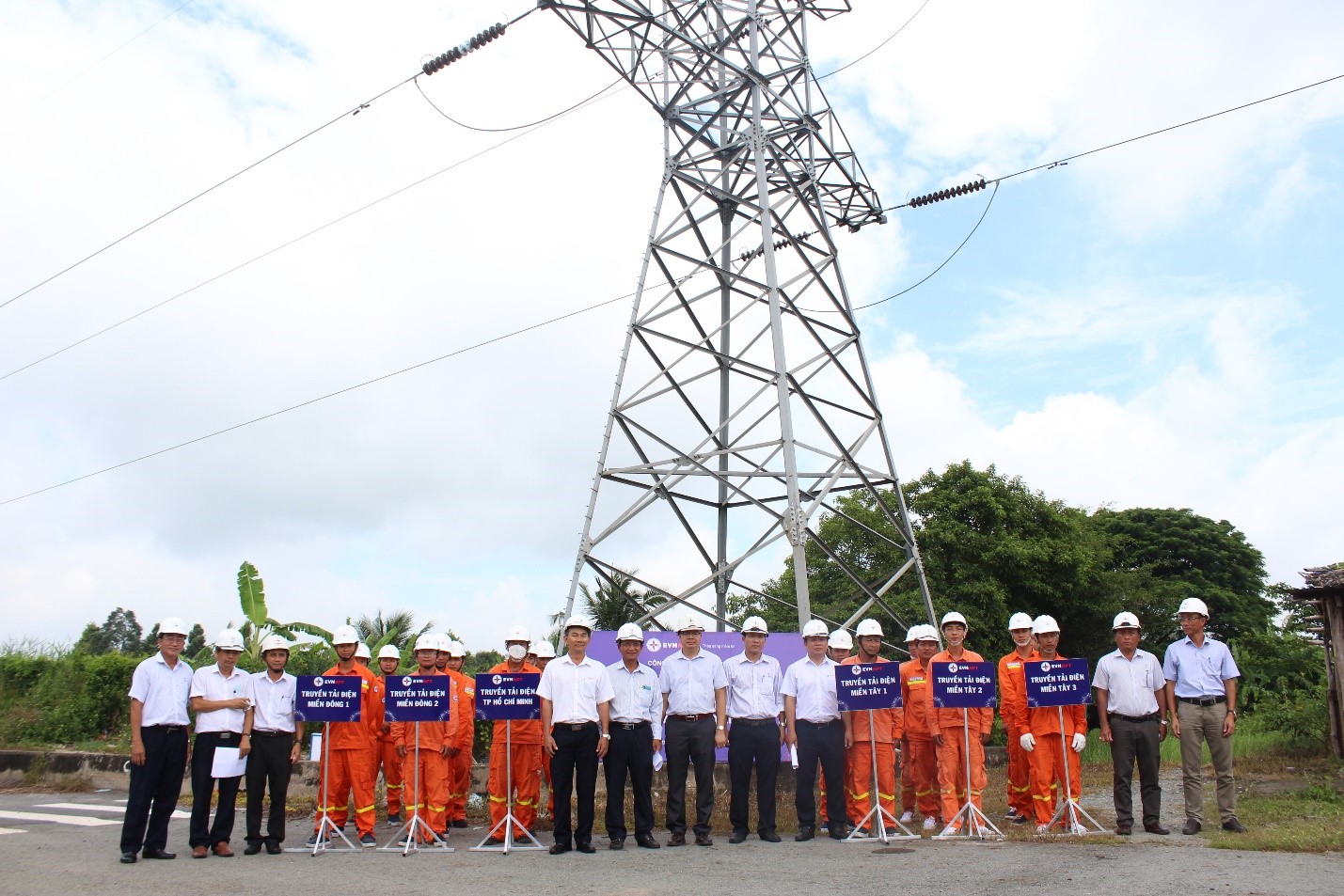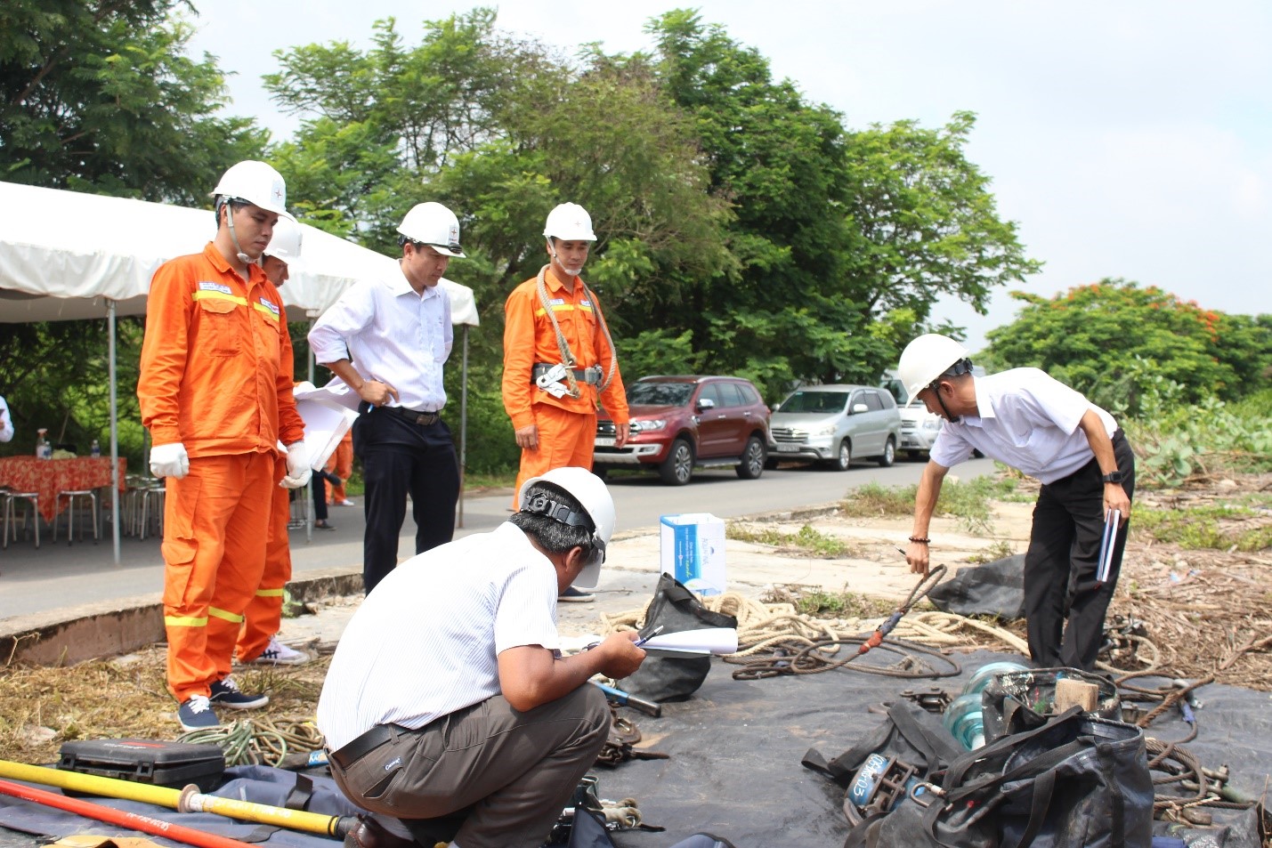 Ban giám khảo và các Đội thi phần thi QLVH đường dây truyền thống tổ chức tại vị trí trụ 73 đường dây 220kV Long An –Mỹ Tho