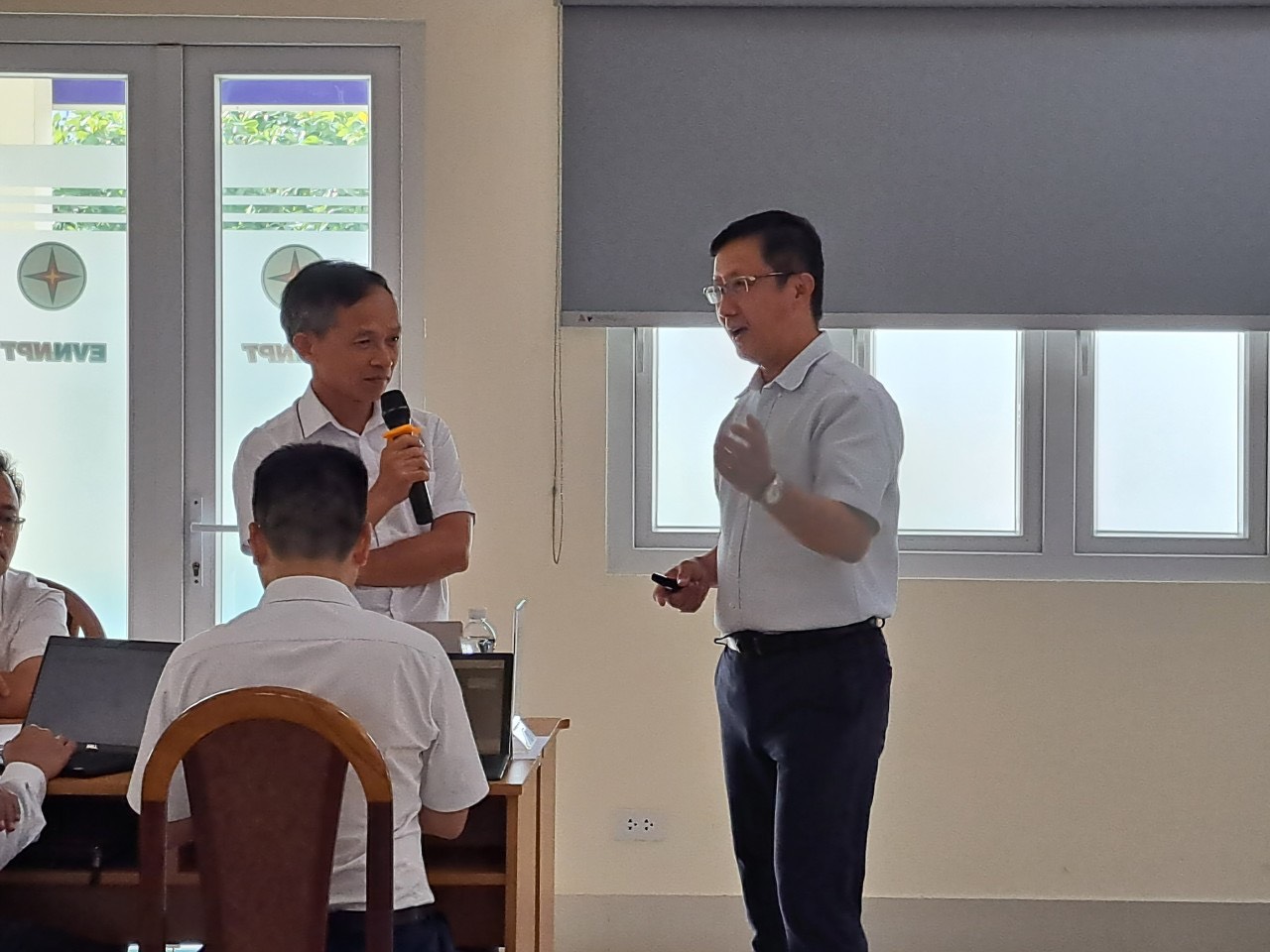 Ông Lê Xuân Hoan – Phó Trưởng Ban phụ trách Ban Truyền thông EVNNPT chia sẻ tình huống thực tế trong công tác quản trị VHDN với Giảng viên Lê Thanh Hải - Chủ tịch Công ty Cổ phần People One