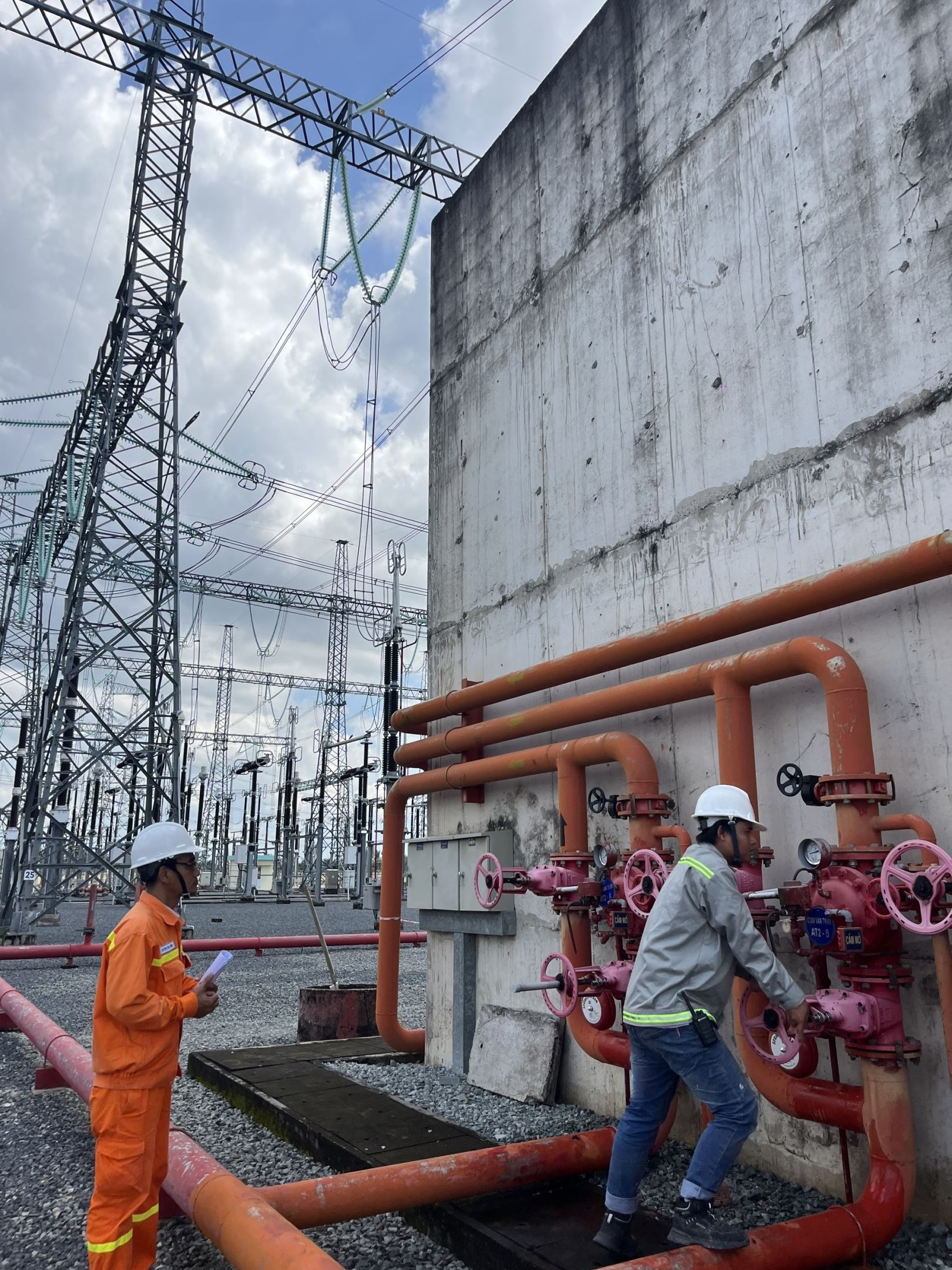 Điều hành viên Trạm 500kV Mỹ Tho phối hợp với Nhân viên Công ty TNHH MTV ACE Cửu Long kiểm tra hệ thống phun sương PCCC MBA AT2.