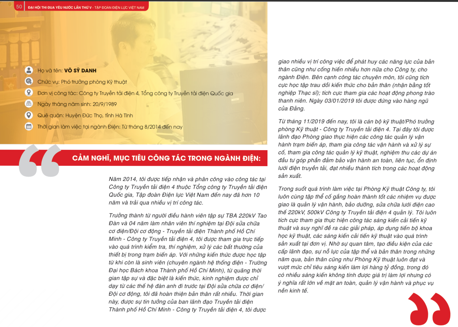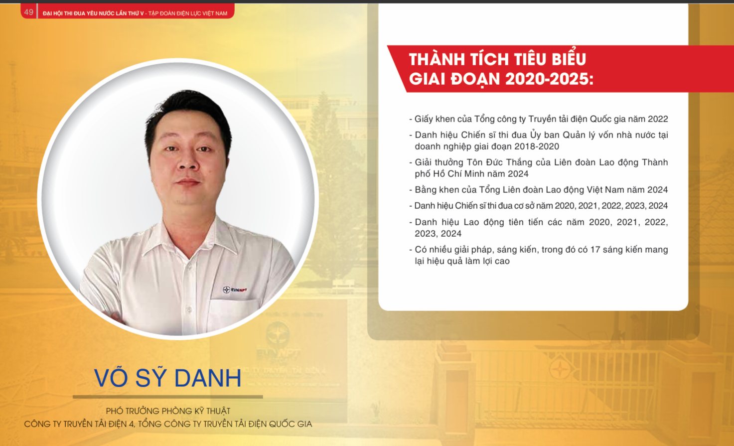 Việc được xướng tên trong danh sách 77 cá nhân tiêu biểu toàn ngành là minh chứng rõ nét cho những đóng góp vượt trội của Kỹ sư Danh trong suốt 5 năm qua. Anh đã khẳng định năng lực chuyên môn và tinh thần đổi mới thông qua 16 sáng kiến cải tiến kỹ thuật. Nổi bật nhất là sáng kiến "Giải pháp hoàn thiện F85, F87L của các đường dây 220kV đang vận hành", mang lại giá trị làm lợi lên đến 11 tỷ đồng. Sáng kiến này không chỉ giúp khắc phục sự cố nhanh chóng mà còn đảm bảo vận hành ổn định, liên tục của hệ thống lưới điện truyền tải quốc gia.