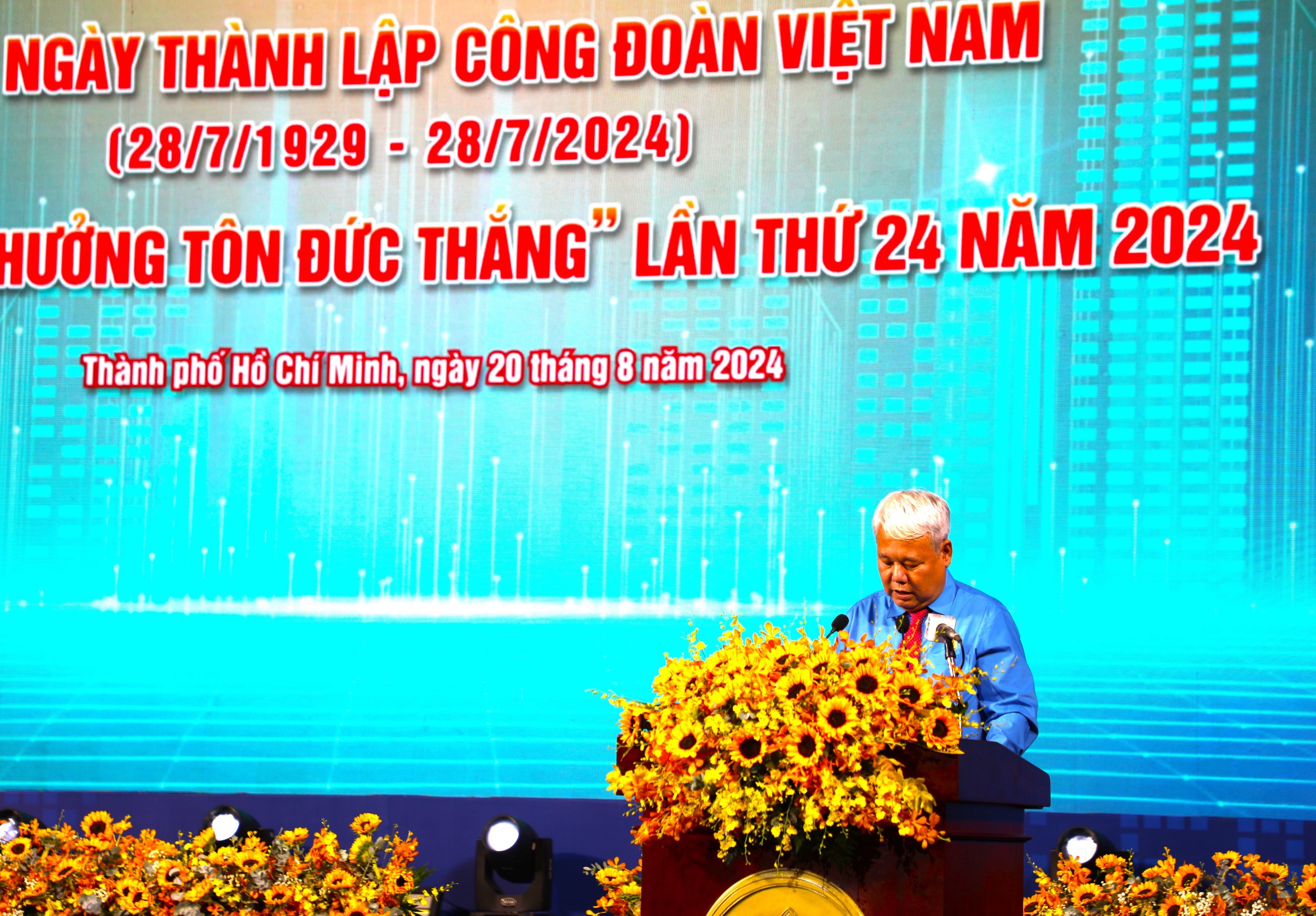Phát biểu tại lễ kỷ niệm, Chủ tịch LĐLĐ TP Hồ Chí Minh Võ Khắc Thái khẳng định, các gương đoạt Giải thưởng Tôn Đức Thắng lần thứ 24, năm 2024 là những tấm gương tiêu biểu trong lao động, sản xuất kinh doanh; là những hạt nhân nòng cốt trong phong trào công nhân, lao động. Đây là những thành quả trong phong trào “Thi đua yêu nước”, phong trào “Lao động giỏi - lao động sáng tạo”, là những gương mặt có nhiều sáng kiến, cải tiến kỹ thuật, nhiều đề tài nghiên cứu khoa học thiết thực được áp dụng thực tiễn. Bên cạnh đó, họ còn là những người thợ đầu đàn luôn tận tâm dìu dắt, hướng dẫn các lớp thợ trẻ nâng cao trình độ tay nghề. Từ đó, góp phần tích cực xây dựng phát triển doanh nghiệp, xây dựng giai cấp công nhân vững mạnh, đáp ứng yêu cầu công nghiệp hóa, hiện đại hóa và hội nhập quốc tế.
