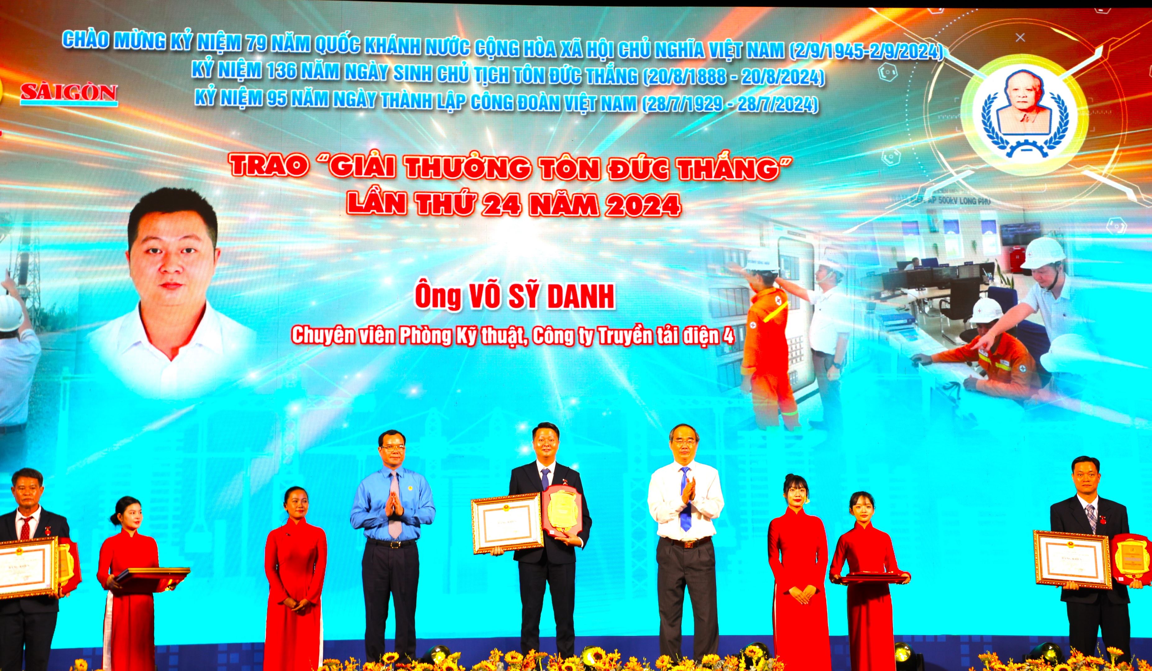 Giải thưởng được trao cho 15 công nhân, kỹ sư có thành tích xuất sắc tiêu biểu nổi bật trong phong trào “Lao động giỏi, lao động sáng tạo”, có nhiều sáng kiến cải tiến kỹ thuật, nhiều đề tài nghiên cứu khoa học thiết thực, được áp dụng vào quá trình lao động sản xuất kinh doanh. Đây là những cá nhân có thành tích cao trong lao động sáng tạo, có nhiều sáng kiến, cải tiến mang lại hiệu quả, có giá trị làm lợi cho doanh nghiệp, có tinh thần học hỏi cao, nhiệt tình trong đào tạo, truyền nghề cho thế hệ trẻ. Năm nay, LĐLĐ TP Hồ Chí Minh đã nhận được 44 hồ sơ từ 21 đơn vị gửi về tham gia Giải thưởng Tôn Đức Thắng để chọn 15 gương mặt ưu tú tiêu biểu nhất. Công ty Truyền tải điện 4 tiêu biểu có anh Võ Sỹ Danh, Phó Trưởng phòng Kỹ thuật đạt giải năm nay, anh vinh dự được ông Nguyễn Đình Khang, Ủy viên Trung ương Đảng, Bí thư Đảng đoàn, Chủ tịch Tổng LĐLĐ Việt Nam và ông Nguyễn Thiện Nhân, nguyên Ủy viên Bộ Chính trị, nguyên Bí thư Thành ủy TP Hồ Chí Minh trao Giải thưởng. Trong 24 năm qua, Công ty Truyền tải điện 4 có 17 lần tham dự giải với 17 cán bộ, công nhân ưu tú đạt giải thưởng cao quý này.