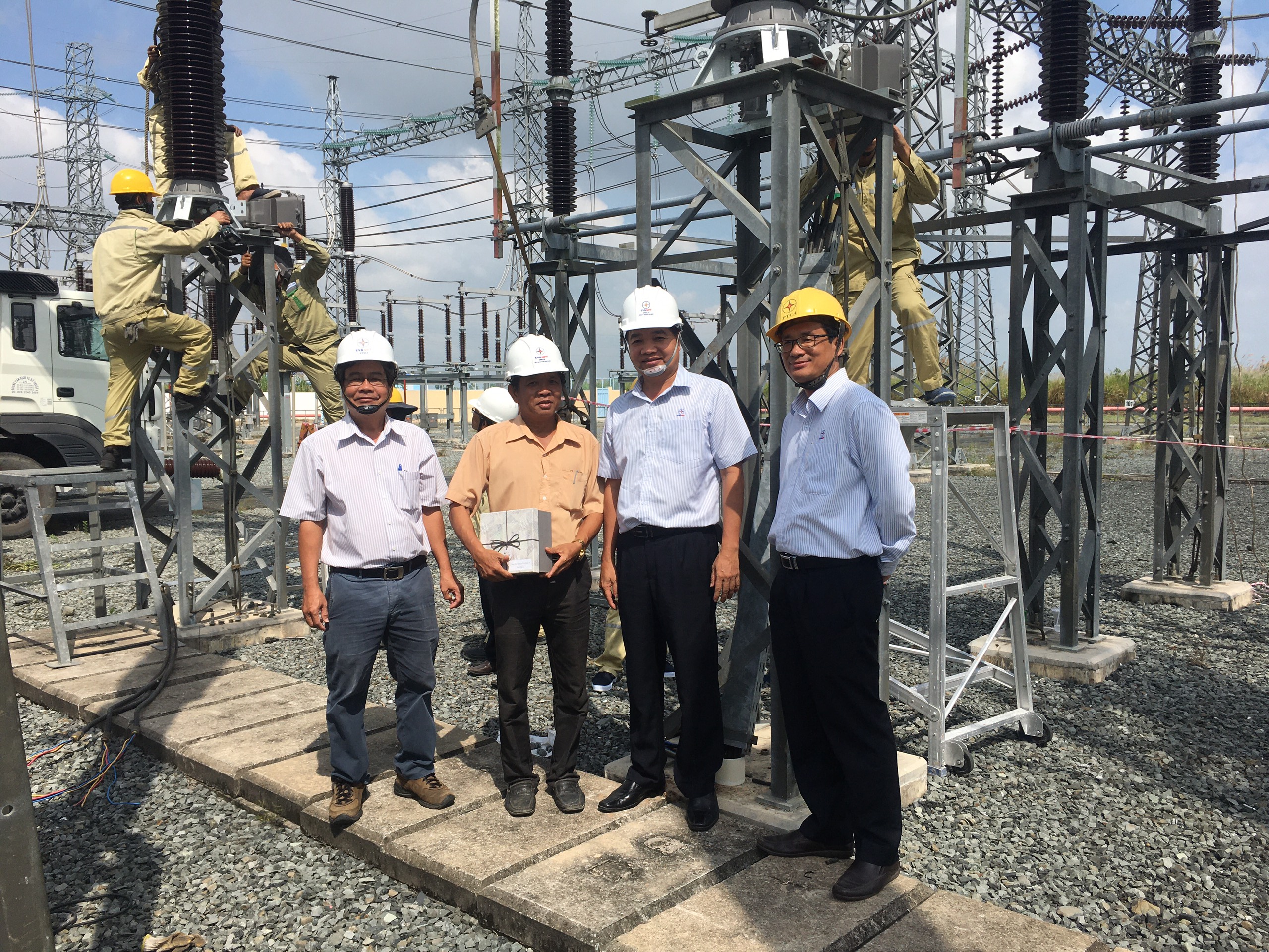 Ông Võ Đình Thủy – Giám Đốc Công ty (Thứ hai từ phải qua) và Ông Nguyễn Phương Nam – Chủ tịch Công Đoàn Công ty (Bìa phải) tặng quà cho Trạm 220kV Ô Môn 2.