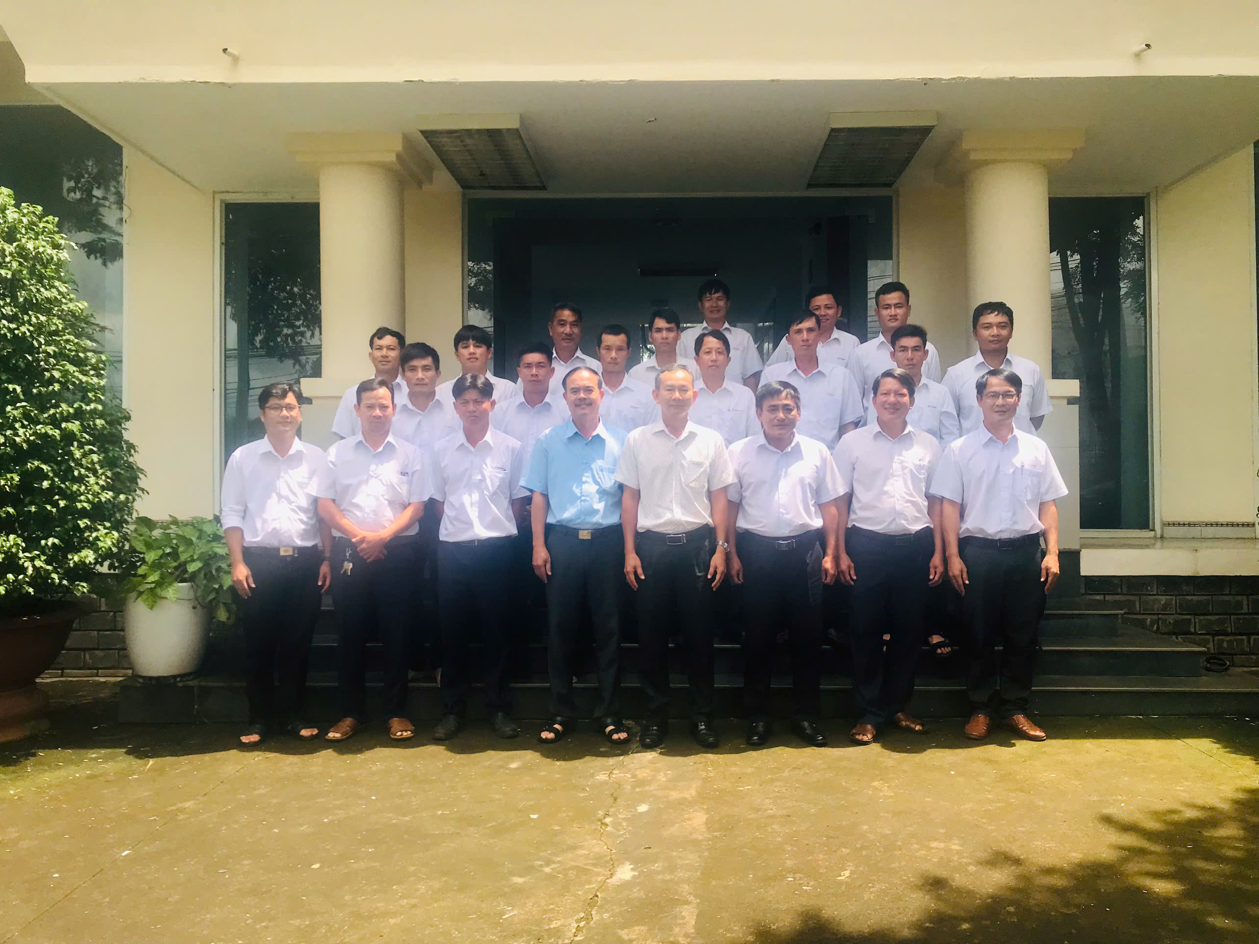 Ảnh: Đoàn chụp ảnh lưu niệm tại cổng trước trụ sở Tổ QLVH ĐD Bù Đăng.