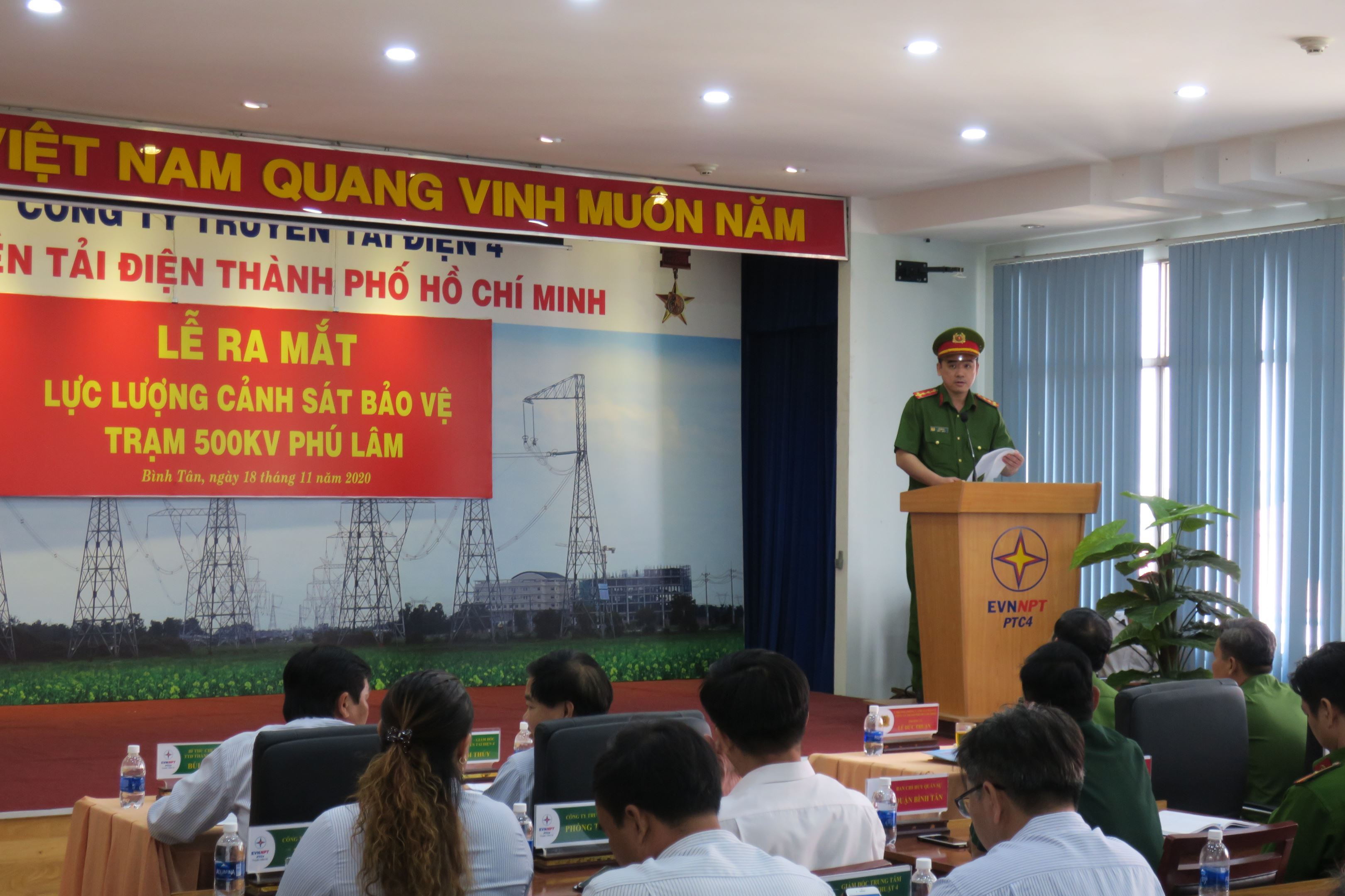 Tiếp theo buổi Lễ, đại diện phòng Cảnh sát Bảo vệ - Công an Thành phố Hồ Chí Minh, đồng chí Phó Đội trưởng Đội Chính trị Hậu cần, Đại úy Lê Tấn Tài công bố Quyết định của phòng Cảnh sát Bảo vệ giao nhiệm vụ cho Đại đội 3 thực hiện bảo vệ Trạm 500kV Phú Lâm theo chuyên môn nghiệp vụ và phù hợp theo Quy chế phối hợp về công tác bảo vệ Trạm 500kV Phú Lâm được ký kết giữa phòng Cảnh sát Bảo vệ với đơn vị quản lý vận hành.
