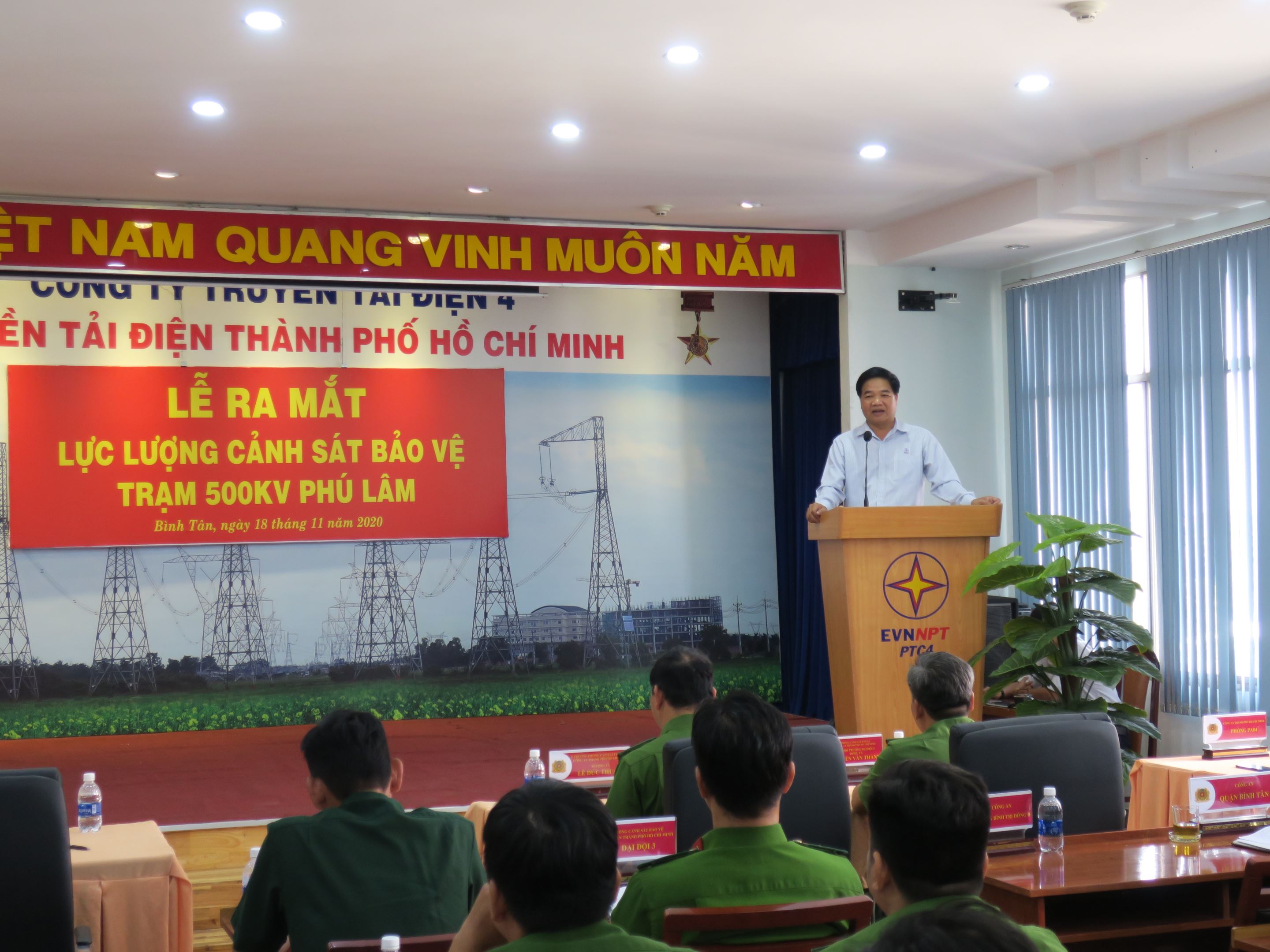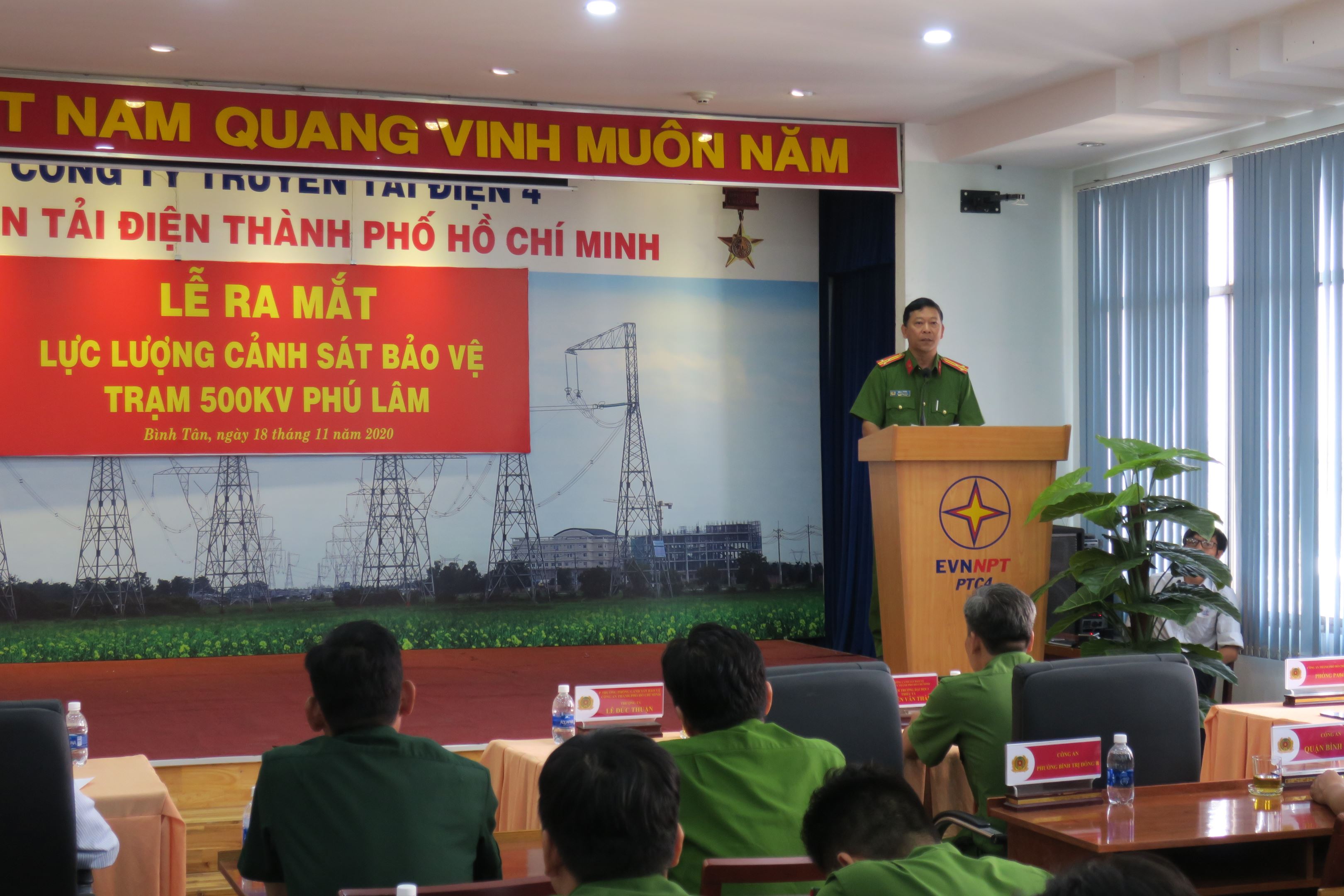 Phát biểu tại buỗi Lễ, đồng chí Thượng tá Lê Đức Thuận – Phó trưởng phòng Cảnh sát Bảo vệ đánh giá cao sự phối hợp của Truyền tải điện Thành phố Hồ Chí Minh – Công ty Truyền tải điện 4 trong công tác khảo sát, bố trí lực lượng Cảnh sát Bảo vệ Trạm 500kV Phú Lâm, song song đó là sự hỗ trợ trong công tác bố trí doanh trại, trang thiết bị phục vụ trong công tác chuyên môn, cũng như trang thiết bị phục vụ nhu cầu sinh hoạt của lực lượng Cảnh sát làm nhiệm vụ Bảo vệ Trạm 500kV Phú Lâm. Đồng chí Thuận mong muốn sẽ tiếp tục nhận được sự phối hợp tốt của đơn vị quản lý vận hành trong thời gian tới. Ngoài ra, đồng chí Thượng tá Lê Đức Thuận chỉ đạo lực lượng Cảnh sát làm nhiệm vụ Bảo vệ Trạm 500kV Phú Lâm phải chủ động phối hợp tốt với lực lượng quản lý vận hành nhằm thực hiện tốt nhiệm vụ chuyên môn, tuyệt đối tuân thủ về hướng dẫn an toàn điện khi thực hiện nhiệm vụ Bảo vệ tại Trạm.