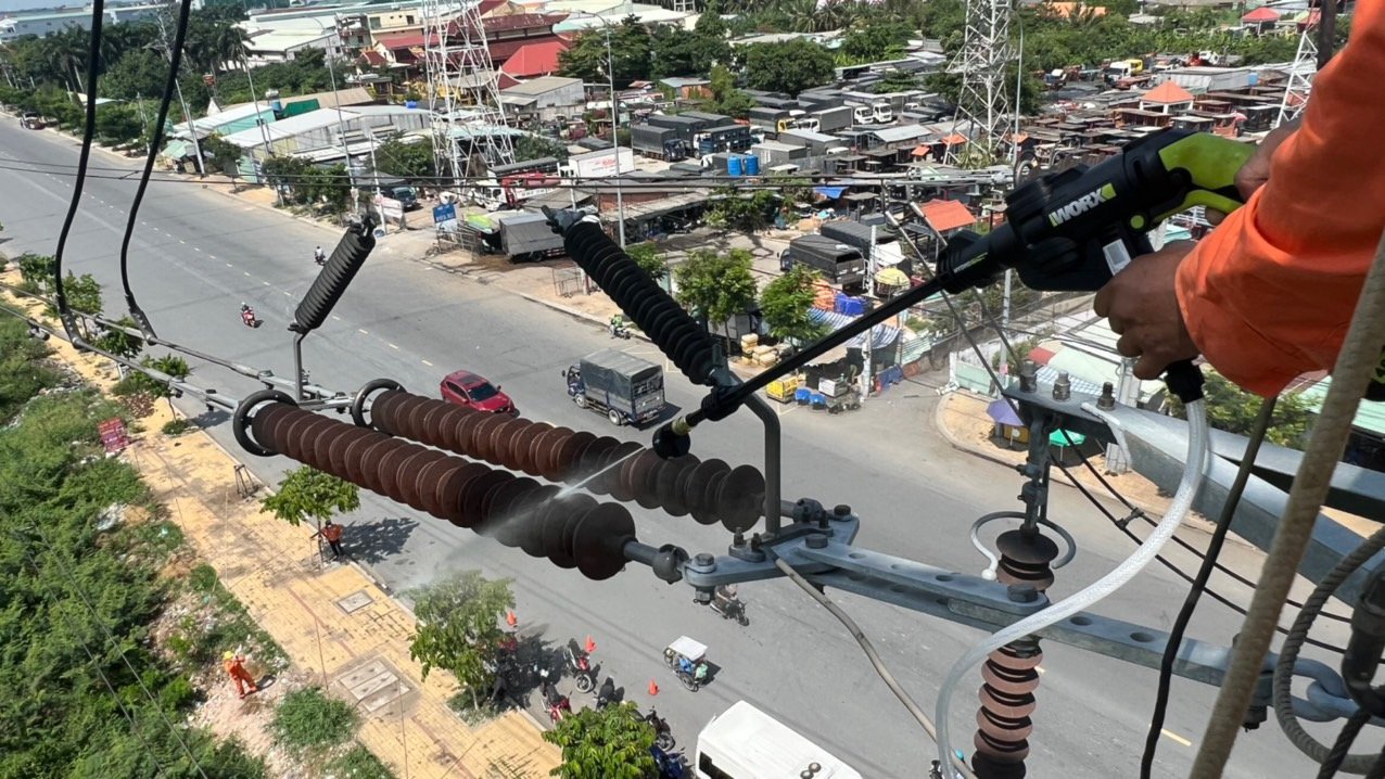 Vệ sinh sứ cách điện đường dây bằng xịt nước áp lực cao.