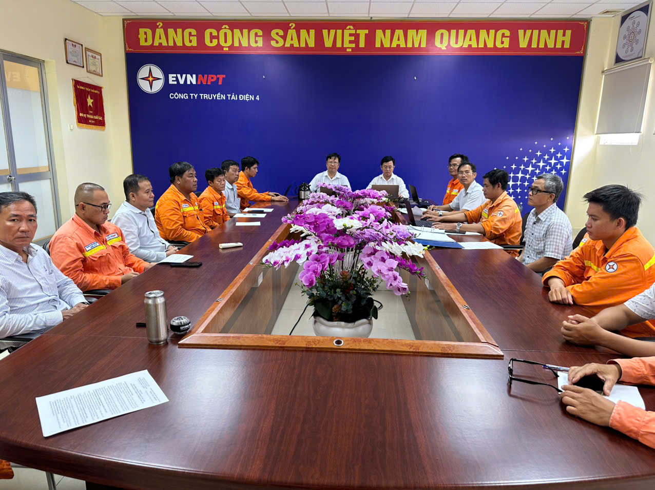 Anh Nguyễn Tuấn Hải và CBCNV Tổ QLVH TBA 500kV Tân Định tại buổi bồi huấn, trao đổi nội bộ.