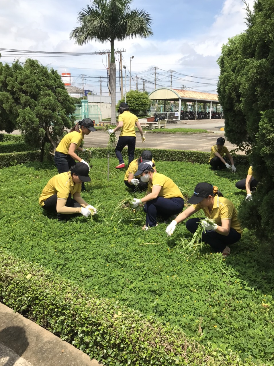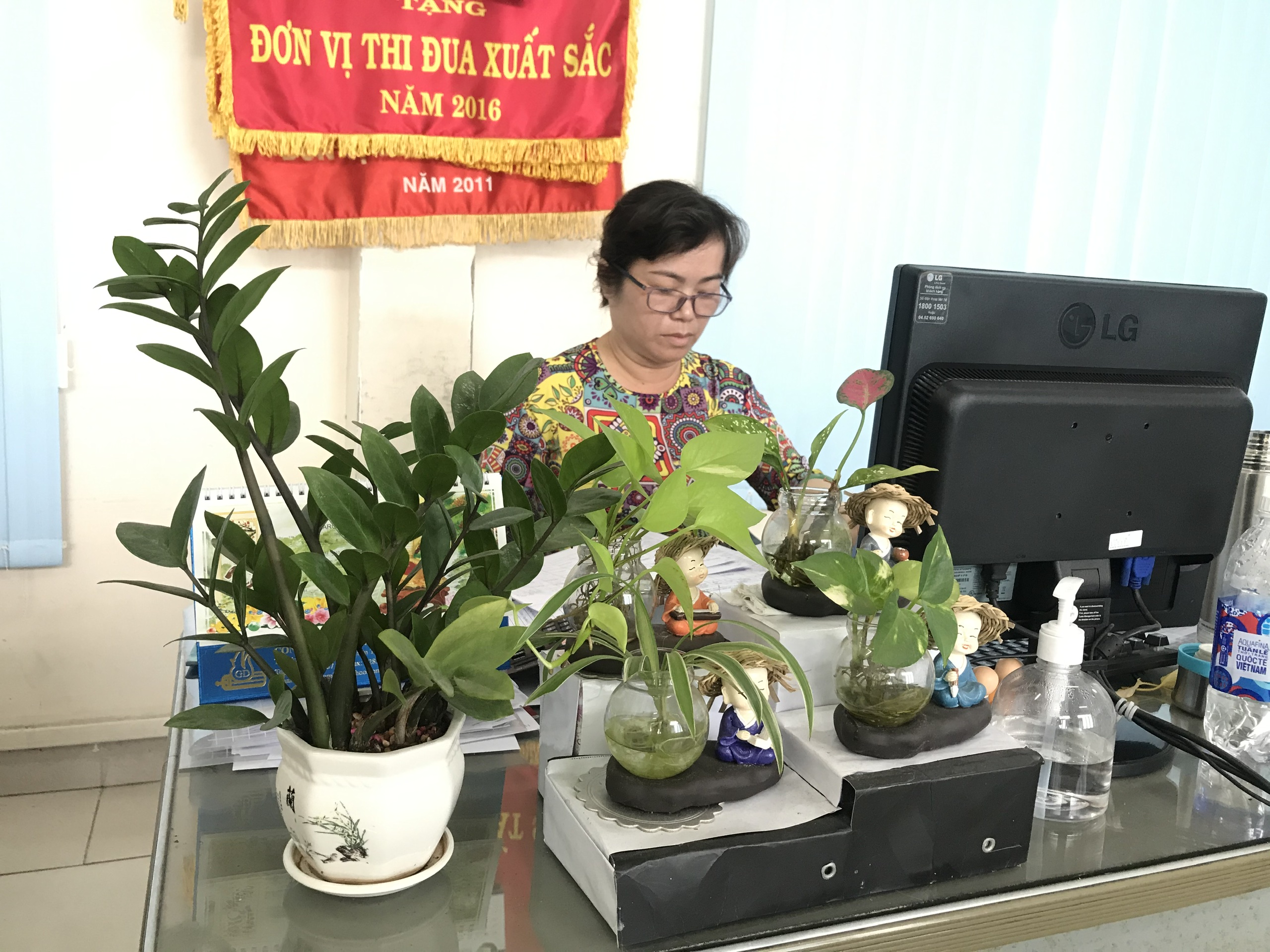 Nữ công chăm sóc mảng xanh góp phần giữ gìn không gian nơi làm việc.